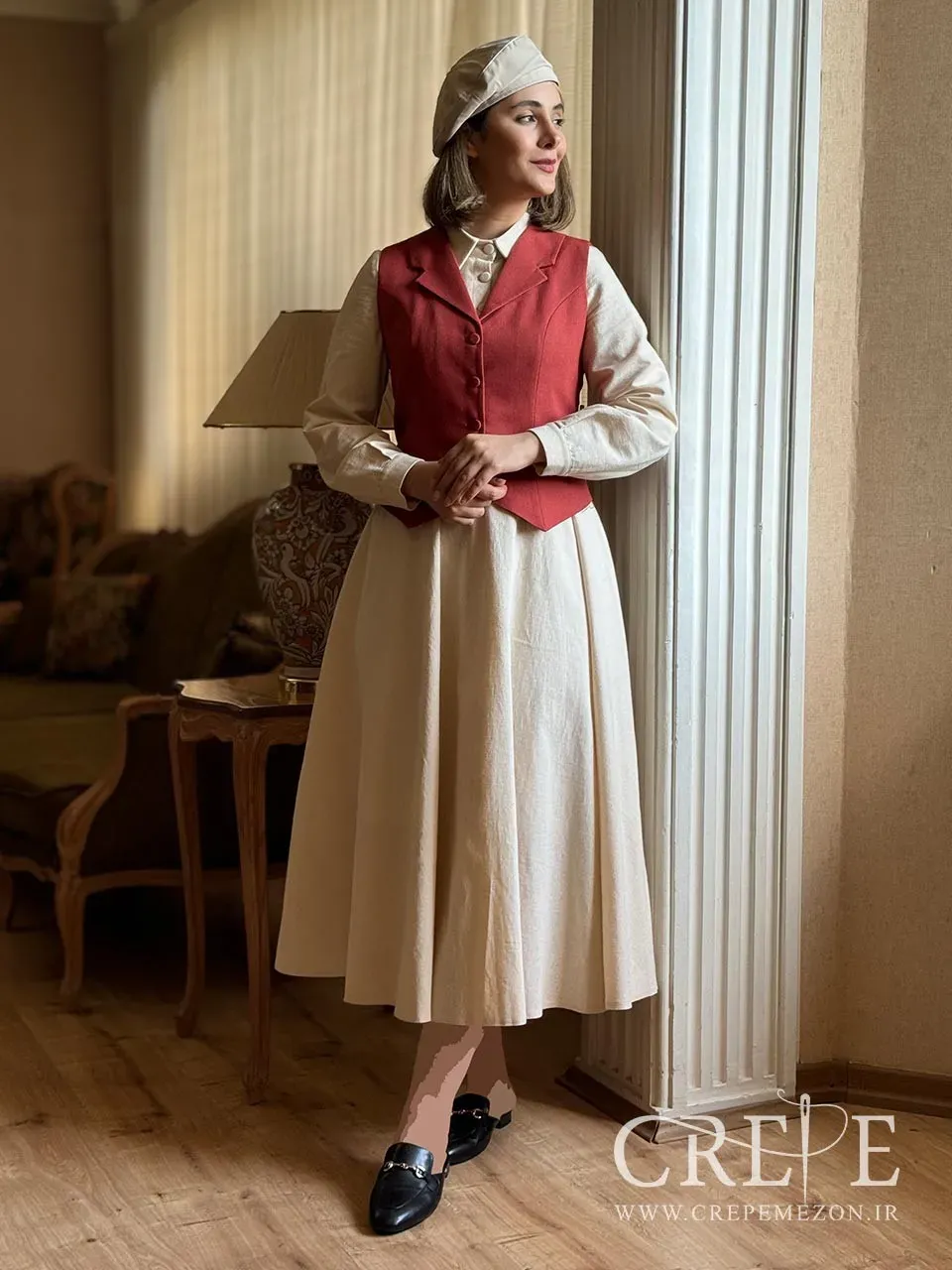 جلیقهای که در تصویر مشاهده میشود، دارای رنگ قرمز تیره یا ماهاگونی است و طراحی ساده و شیکی دارد. این جلیقه تا حدی کوتاه است و طول آن به بالای کمر میرسد. جلوی جلیقه با چند دکمه همرنگ دوخته شده بسته میشود. یقهی آن یقهی برگردان به سبک کلاسیک است که به جذابیت لباس افزوده است. پارچهی استفاده شده در ساخت جلیقه بافتی لطیف دارد چرا که از جنس لینن می باشد. این جلیقه زیبا برای استایل های اسپرت و کژوال گزینه ی محبوبی است. سایزبندی از 38 تا 44 می باشد و رنگبندی آن عنابی، سبز و نسکافه ای می باشد. رنگ های این جلیقه اسپرت آستردار با انواع رنگ های دیگر قابل ست شدن است و استایل چشمگیر و پر انرژی به شما هدیه می دهد.