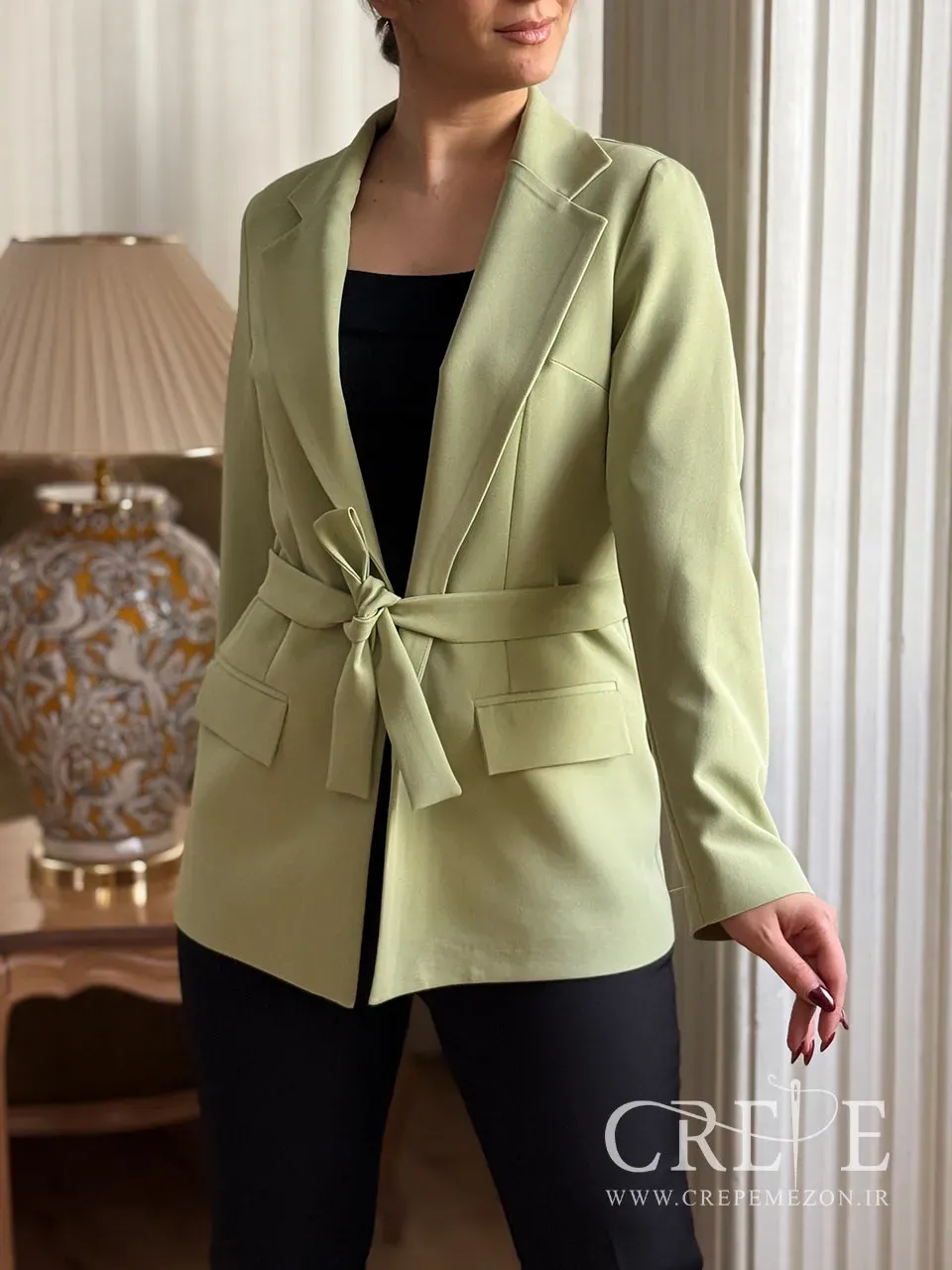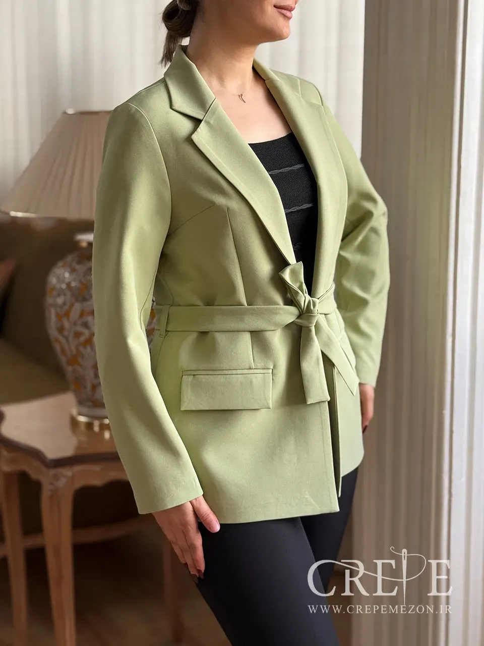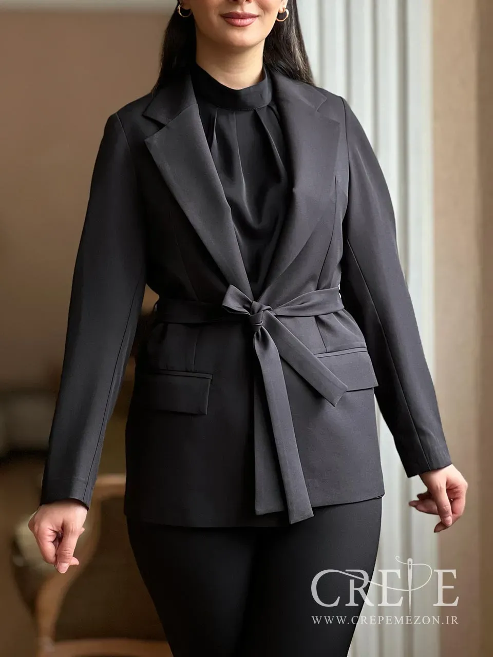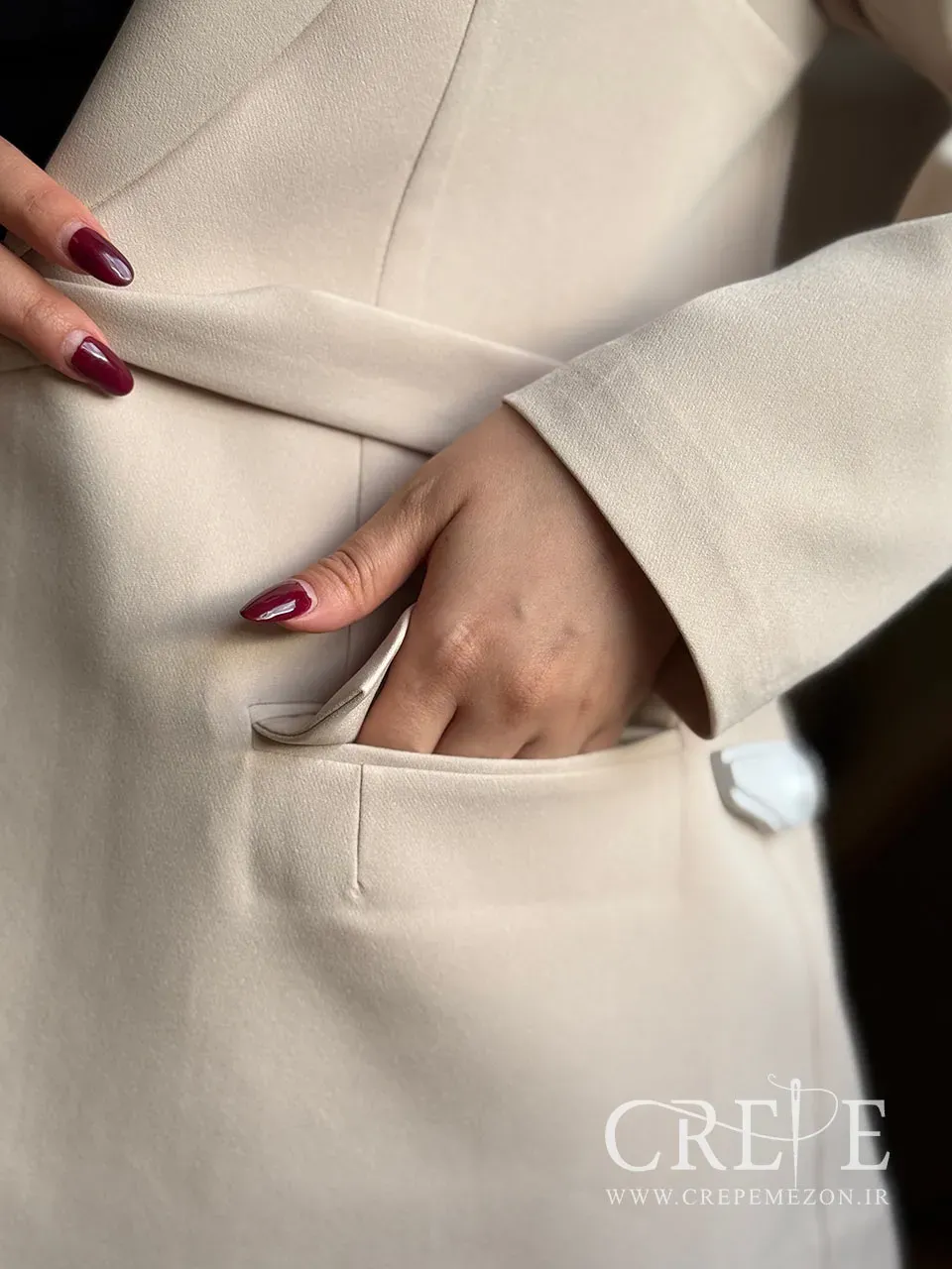 آستینها بلند هستند و برش صاف دارند که راحتی بیشتری را برای پوشنده فراهم میآورند. در قسمت جلوی این مانتو کژوال دو جیب بزرگ تعبیه شدهاند که علاوه بر زیبایی، کاربردی نیز میباشند. ویژگی برجسته این کت استفاده از کمربند همرنگ و هم جنس پارچه است که در دور کمر بسته میشود. همانطور که می دانید کمربند ها فرم بدن را بهتر نشان داده و جلوهای زیباتر به آن می بخشند. کت تک زنانه همراه با جزئیات دقیق دوخت، انتخاب مناسبی برای کسانی است که به دنبال لباسی شیک، کاربردی و راحت هستند. این مانتو کرپ زیبا قابل ترکیب با انواع بلوزها، پیراهنها یا حتی تیشرتهای ساده بوده و به خوبی با شلوارهای مختلف هماهنگ میشود تا سبکهای متفاوت پوشش را کامل کند.