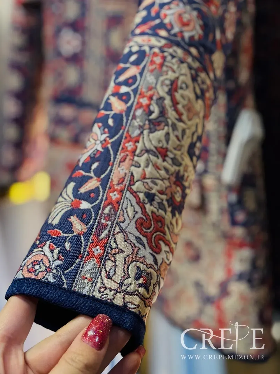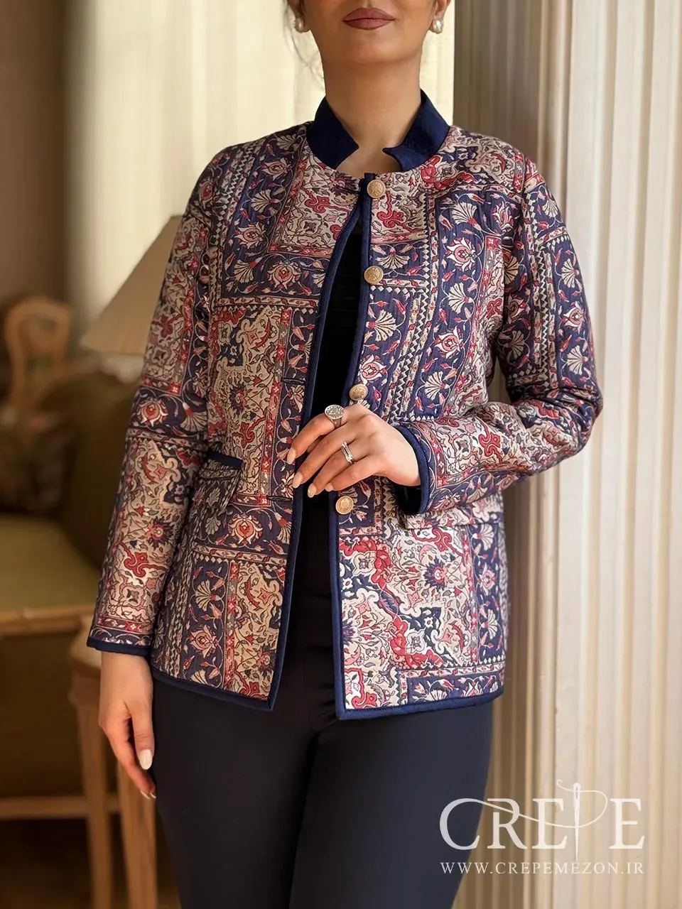 کت ژاکارد یقه فرنچ یک کت مجلسی زیبا که به عنوان یک انتخاب شیک و مد روز برای مجالس و مهمانیها شناخته میشود. این کت مجلسی از پارچه ژاکارد با طرح سنتی تولید شده است. پارچه ژاکارد به خاطر بافت برجسته و طراحیهای زیبا، انتخابی مناسب برای لباسهای مجلسی است. طرح سنتی آن به این کت زیبایی و جذابیت خاصی میبخشد. همانطور که در تصویر می بینید رنگهای سفید، قرمز و سرمهای به کار رفته در این کت، تضاد زیبا و دلنشینی ایجاد میکند که میتواند با انواع لباسها و اکسسوریها هماهنگ شود. کت دارای یقه فرنچ است که این نوع یقه نه تنها ظاهری کلاسیک و شیک به کت میدهد، بلکه به آن حالت رسمیتری نیز میبخشد.