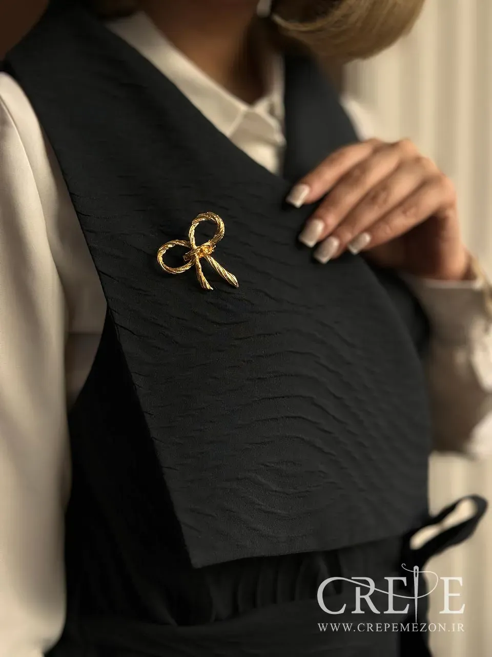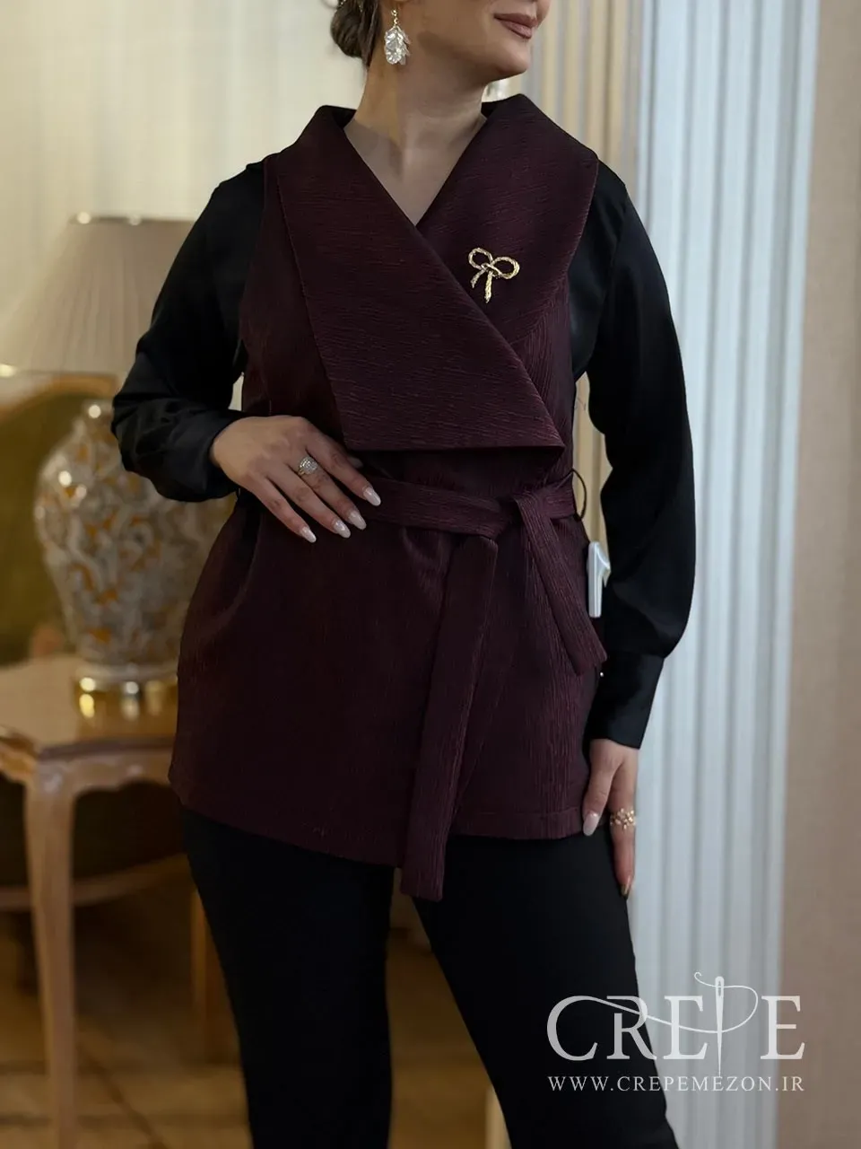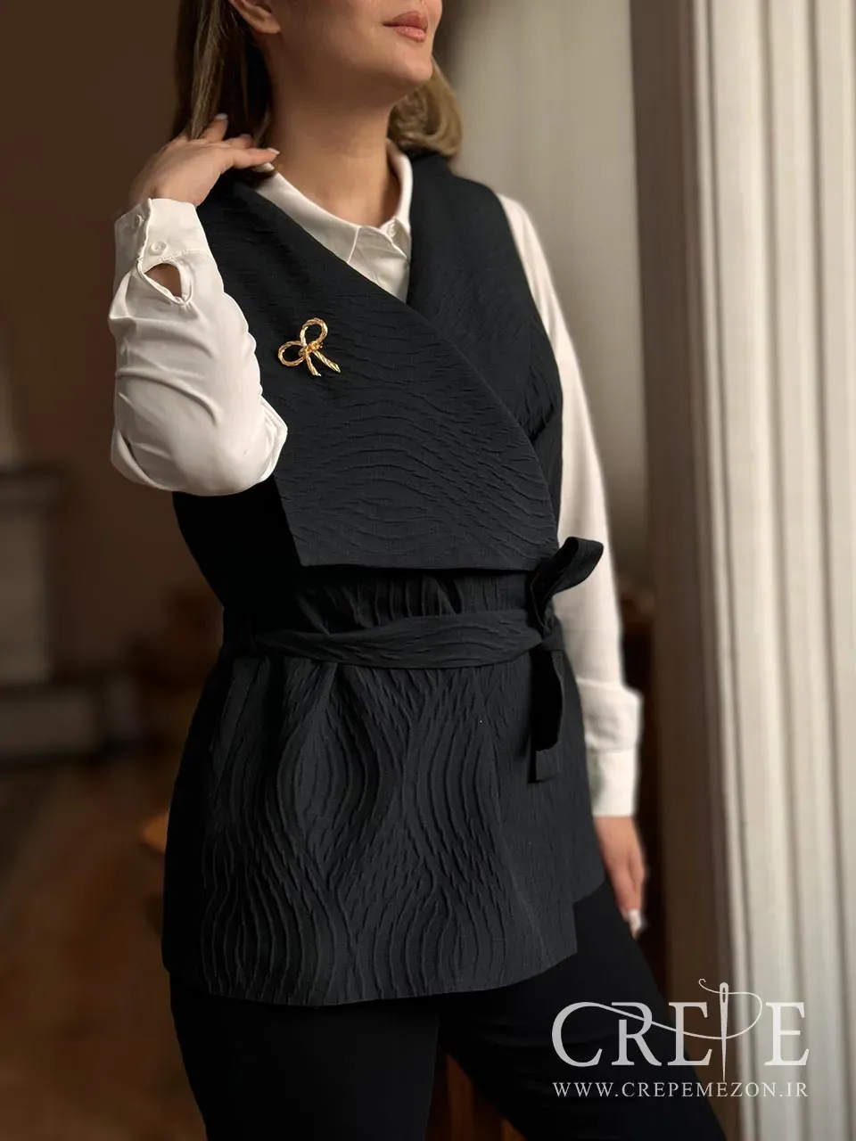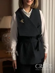 وجود کمربند از جنس خود پارچه، نه تنها به تناسب و فرم دهی بهتر بدن کمک میکند، بلکه به زیبایی و هماهنگی کلی وست نیز میافزاید. سنجاق سینه فلزی به شکل پاپیونی که بر روی سینه قرار دارد، جلوهای خاص و متفاوت به این وست میبخشد و میتواند به عنوان یک اکسسوری زیبا در نظر گرفته شود. این وست در سه رنگ مشکی، کرم و زرشکی موجود است که هر کدام از این رنگها میتوانند به سلیقه و استایل شخصی شما پاسخ دهند. رنگ مشکی برای موقعیتهای رسمی و شب، رنگ کرم برای روزهای بهاری و رنگ زرشکی به عنوان انتخابی جذاب و شیک میتواند مورد استفاده قرار گیرد.