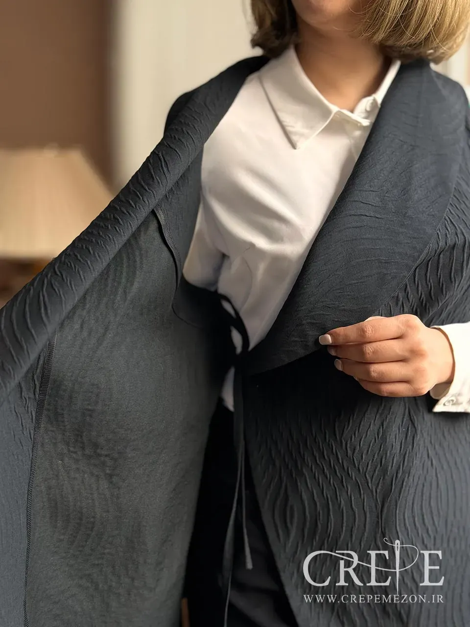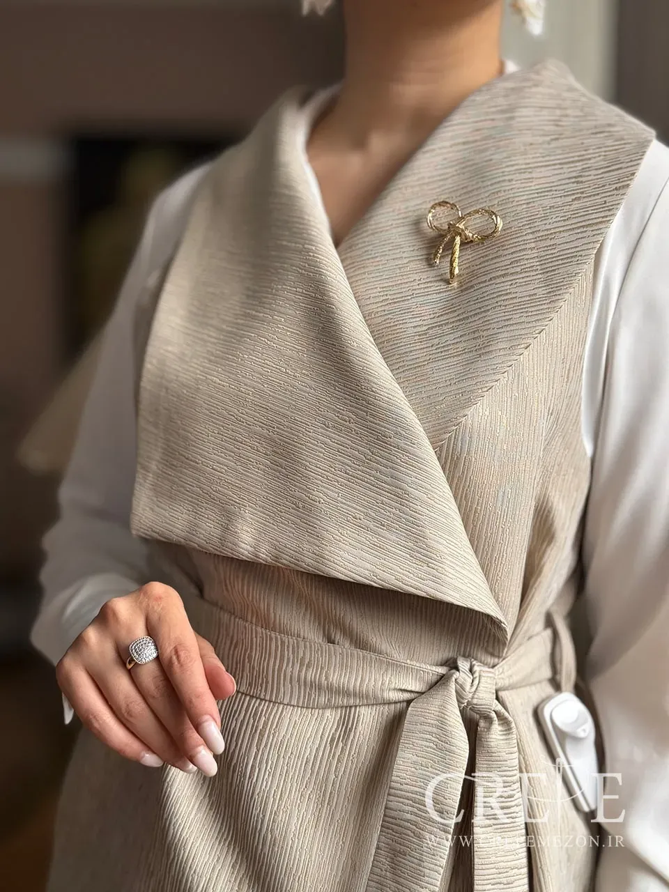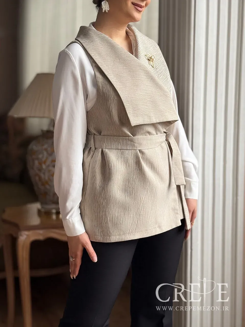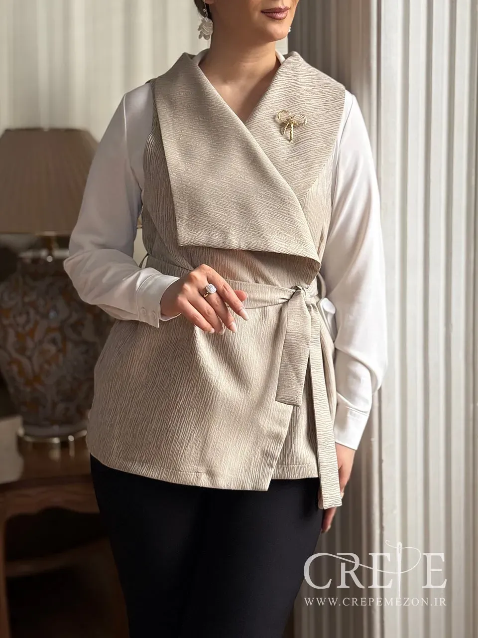 وجود کمربند از جنس خود پارچه، نه تنها به تناسب و فرم دهی بهتر بدن کمک میکند، بلکه به زیبایی و هماهنگی کلی وست نیز میافزاید. سنجاق سینه فلزی به شکل پاپیونی که بر روی سینه قرار دارد، جلوهای خاص و متفاوت به این وست میبخشد و میتواند به عنوان یک اکسسوری زیبا در نظر گرفته شود. این وست در سه رنگ مشکی، کرم و زرشکی موجود است که هر کدام از این رنگها میتوانند به سلیقه و استایل شخصی شما پاسخ دهند. رنگ مشکی برای موقعیتهای رسمی و شب، رنگ کرم برای روزهای بهاری و رنگ زرشکی به عنوان انتخابی جذاب و شیک میتواند مورد استفاده قرار گیرد.