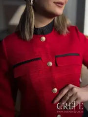 آستینهای کت به سبک پاکتی طراحی شدهاند و رنگ مشکی دارند. این طراحی میتواند تضاد زیبایی با رنگ قرمز اصلی کت ایجاد کند و ظاهری مدرن و شیک به آن ببخشد. یقه کت با پارچه ساتن پلیسه به رنگ مشکی طراحی شده است. استفاده از ساتن به کت جلوهای براق و لوکس میبخشد و پلیسهها نیز میتوانند حرکتی جذاب و دینامیک به یقه اضافه کنند. کت به صورت جلو دکمهای طراحی شده است. دکمهها از رنگ طلایی برخوردارند که به کت حس تجمل و زیبایی میدهد. همچنین همانطور که می دانید استایل را مجلسی می سازد.