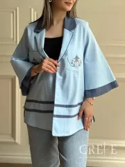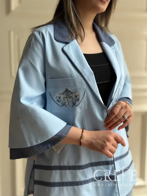 رنگبندی آبی روشن که حس طراوت و شادابی را به همراه دارد و برای مجالس و مهمانیهای رسمی بسیار مناسب است. دارای یقه انگلیسی است، که استایلی کلاسیک و شیک را به مانتو میبخشد. این نوع یقه به زیبایی با طراحی کلی مانتو هماهنگ شده و ظاهری مدرن و مرتب ایجاد میکند. این مانتو با گلدوزیهای ظریف و هنرمندانه تزئین شده است. گلدوزیها معمولاً در قسمتهای مختلف مانند حاشیه یقه، لبههای کنار، قسمت پایین مانتو یا روی لایههای داخلی قرار دارند، که باعث افزایش جذابیت و فاخر بودن آن میشود. این مانتو انتخابی بینظیر برای شیک پوشان است.