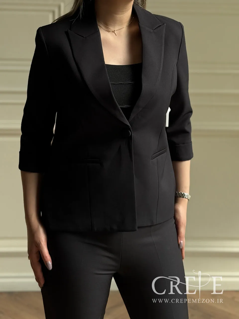 این کت با یک دکمه تک بسته میشود که به طراحی آن زیبایی و سادگی میبخشد. این کت با آستین های پاکتی دارای فیلتاب جیب است که به عنوان جیبهای نمایشی طراحی شدهاند و کاربردی نیستند. این جزئیات به طراحی کت زیبایی بیشتری میبخشد و به آن ظاهری جذاب و خاص میدهد. این مانتو در سایزبندی 48-38 موجود است، که به افراد با سایزهای مختلف این امکان را میدهد تا از آن استفاده کنند. طراحی کلاسیک و آزاد آن به راحتی بر روی بدن نشسته و از لحاظ راحتی و زیبایی مناسب است. این کت به دلیل طراحی خاص و جذابش، گزینهای مناسب برای مجالس، مهمانیها و مراسمهای رسمی است.