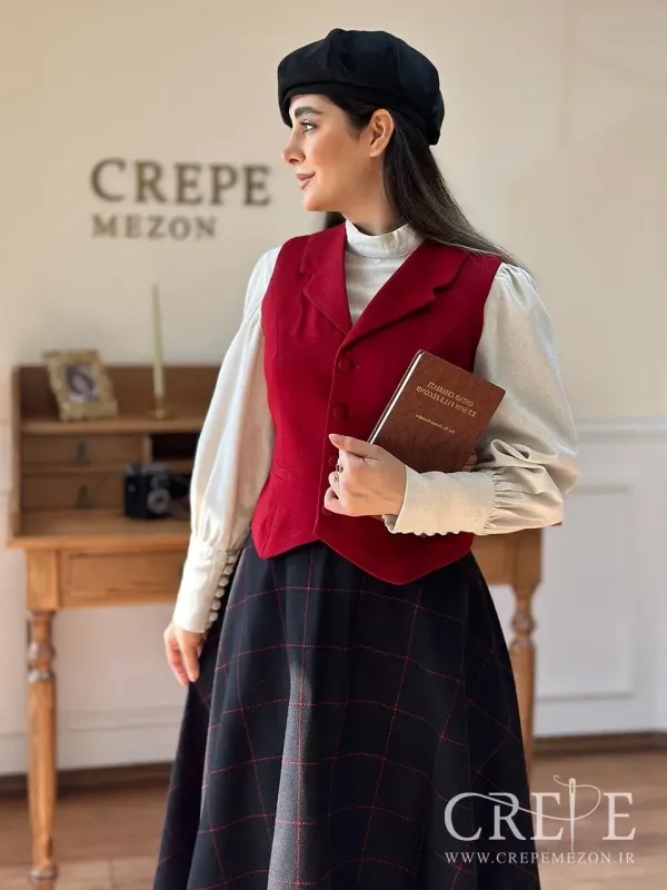 جلیقه کشمیر یقه انگلیسی یک جلیقه کژوال دوستداشتنی که دارای الگوی ساده و بدون طرح و دارای حالتی کلاسیک و شیک می باشد. این جلیقه دکمهدار بوده و شامل سه دکمه در جلو میباشد که به خوبی با طراحی کلی هماهنگ هستند. یقهی آن به صورت یقه انگلیسی طراحی شده که به ظاهری رسمیتر کمک میکند. همچنین، برشها و دوختهای دقیق آن نشان دهندهی کیفیت بالای دوخت است. ترکیب این جلیقه با یک بلوز سفید آستین پفدار باعث ایجاد کنتراست زیبا میان رنگها و طرحها شده است. مدل قرارگیری جلیقه نیز بر روی بدن بسیار مناسب است و از جمله جزئیات جذاب دیگر میتوان به جنبههای ظریف دوخت در قسمت جلوی لباس اشاره کرد که ظاهر کلی را تکمیل میکنند.