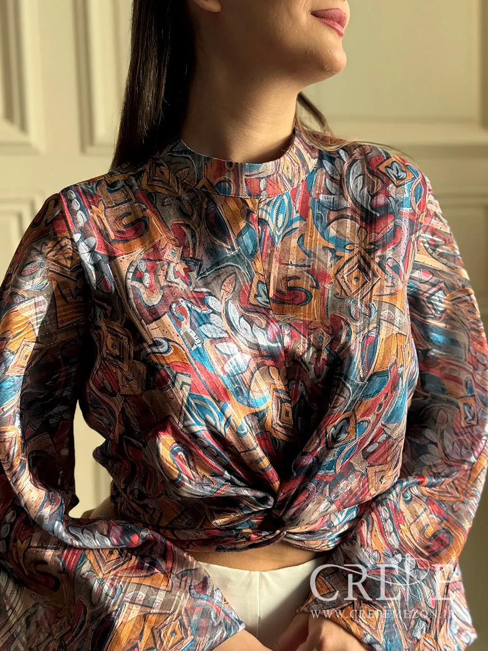 کراپ شومیز کرپ حریر زرباف یکی از زیباترین انواع شومیز های مجلسی موجود در مزون که از جنس کرپ حریر بوده و با زربافتی که الیاف آن تزیین شده است به یک کار سکه دار و باشکوه تبدیل شده است. این شومیز زیبا در قسمت جلو دارای گره می باشد و در قسمت پشت کمر برای ایست بهتر از کش دوزی استفاده شده است. همچنین آستین ها مچی و به حالت کلوش طراحی شده است تا در کنار سادگی که در طرح و مدل خود دارد کار فاخر و مجلسی نیز محسوب شده و چشم ها را به بازی بگیرد. این کراپ شومیز کرپ حریر زرباف برای از بین بردن ویژگی بدن نما بودن پارچه کرپ حریر از آستر ژرسه استفاده کرده است. از این رو با خیال راحت می توانید در تمامی مراسم ها استفاده کنید.