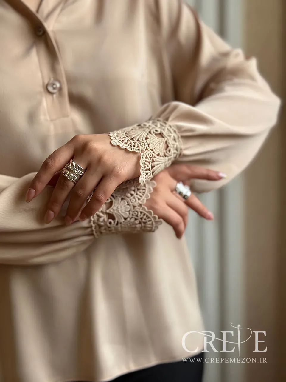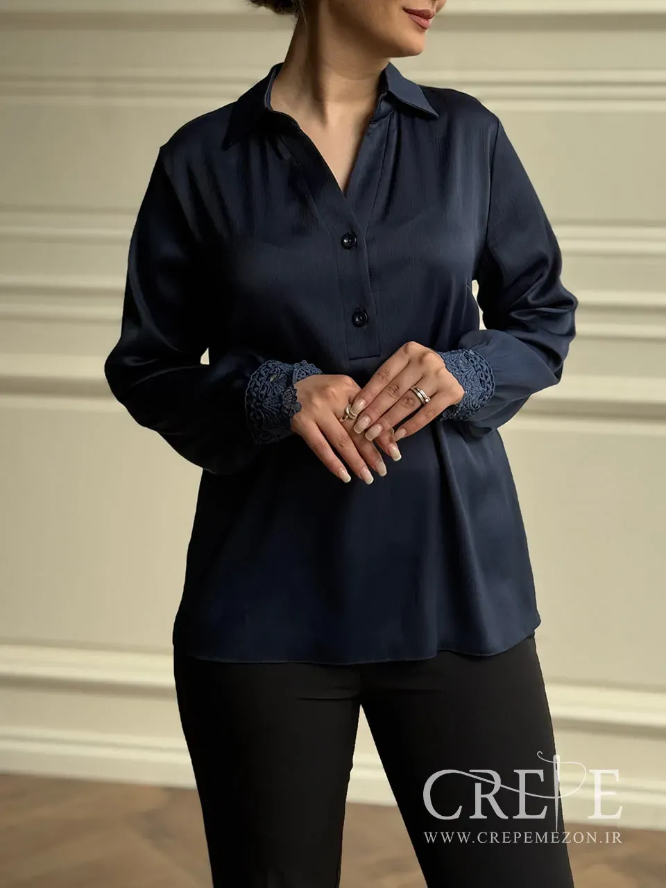 زیر یقه، یک نوار دو دکمه وجود دارد که همرنگ با پارچه شومیز بوده و ظاهر مرتب تری به آن داده است. این دکمهها علاوه بر کاربرد عملیشان برای باز و بسته کردن شومیز ، جنبهی تزئینی نیز دارند. طراحی ساده اما نفیس آن باعث شده تا بتواند توجه بسیاری را جلب کند. آستینهای این شومیز یقه دو دکمه بلند هستند و در انتهای آستینها جزئیاتی زیبا از گیپور دیده میشود. گیپور استفاده شده در سرآستین ها دارای طرح ظریف و هنرمندانه ایست که باعث زیبایی و مجلسی شدن بیشتر شومیز شده است.