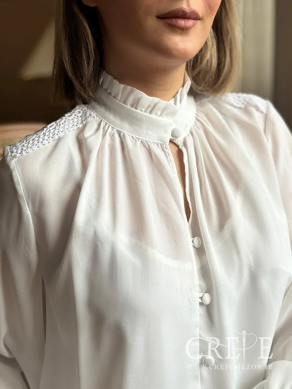 یقه این شومیز مدل ایستاده (Mandarin Collar) است و دارای چینهای ریز و ظریف در قسمت بالای یقه میباشد که به آن جلوهای کلاسیک و شیک میبخشد. همچنین در جلوی یقه یک دکمه وجود دارد که تا بالا بسته شده است. این نوع یقه برای افرادی با گردن بلند مناسبتر است زیرا بلندی نسبی آن میتواند تعادل خوبی را بین طول گردن و بالاتنه ایجاد کند. در صورت داشتن گردن کوتاه، انتخاب این نوع یقه ممکن است گردن را کوتاهتر نشان دهد، لذا بهتر است از مدلهای بازتر استفاده شود. از آنجایی که مدل یقه دکمه دار است میتوانید با باز کردن یقه و استفاده از اکسسوری این شومیز ژرژت را مناسب فرم بدنی خود ساخته و از جذابیت آن لذت ببرید.