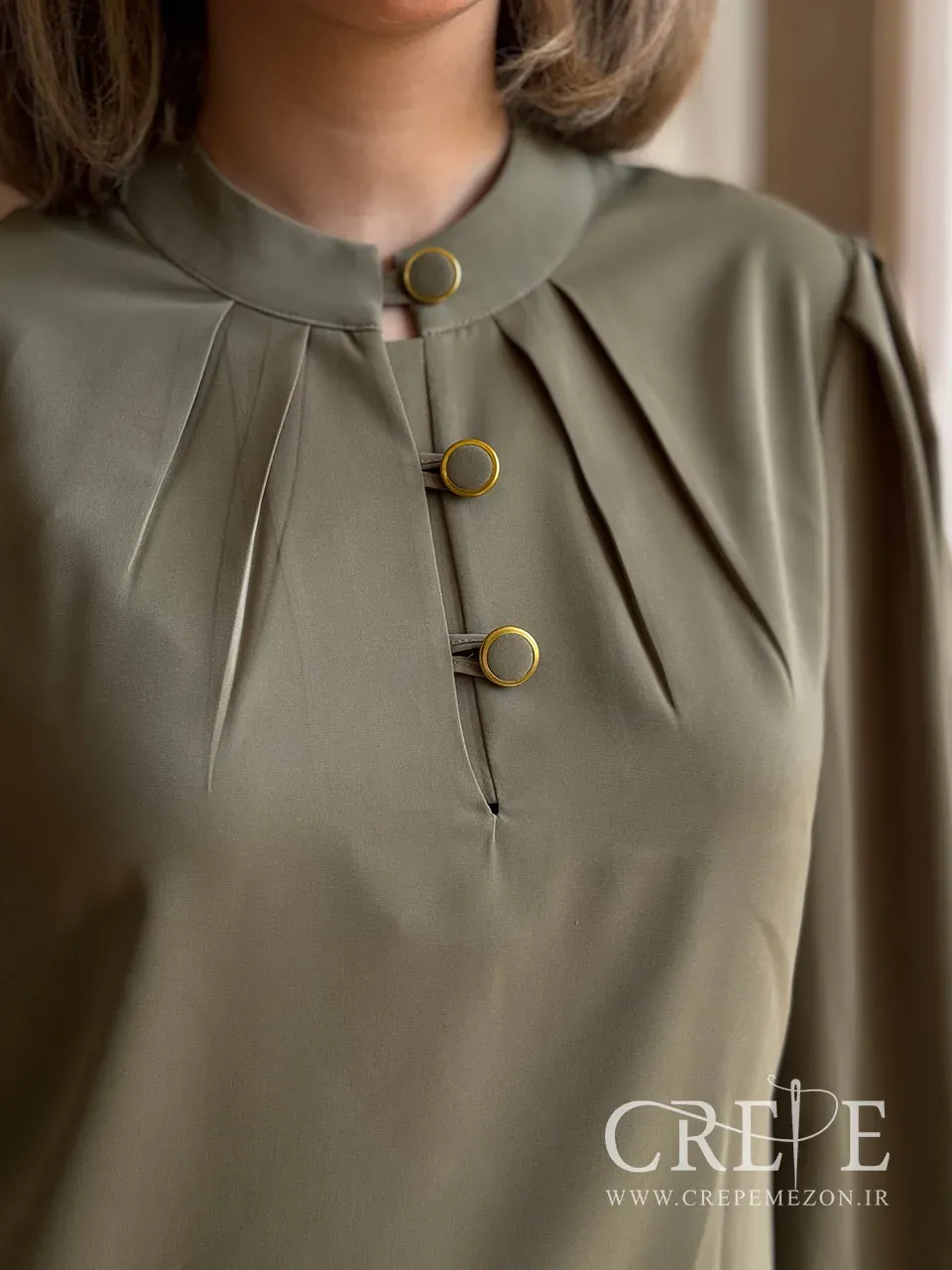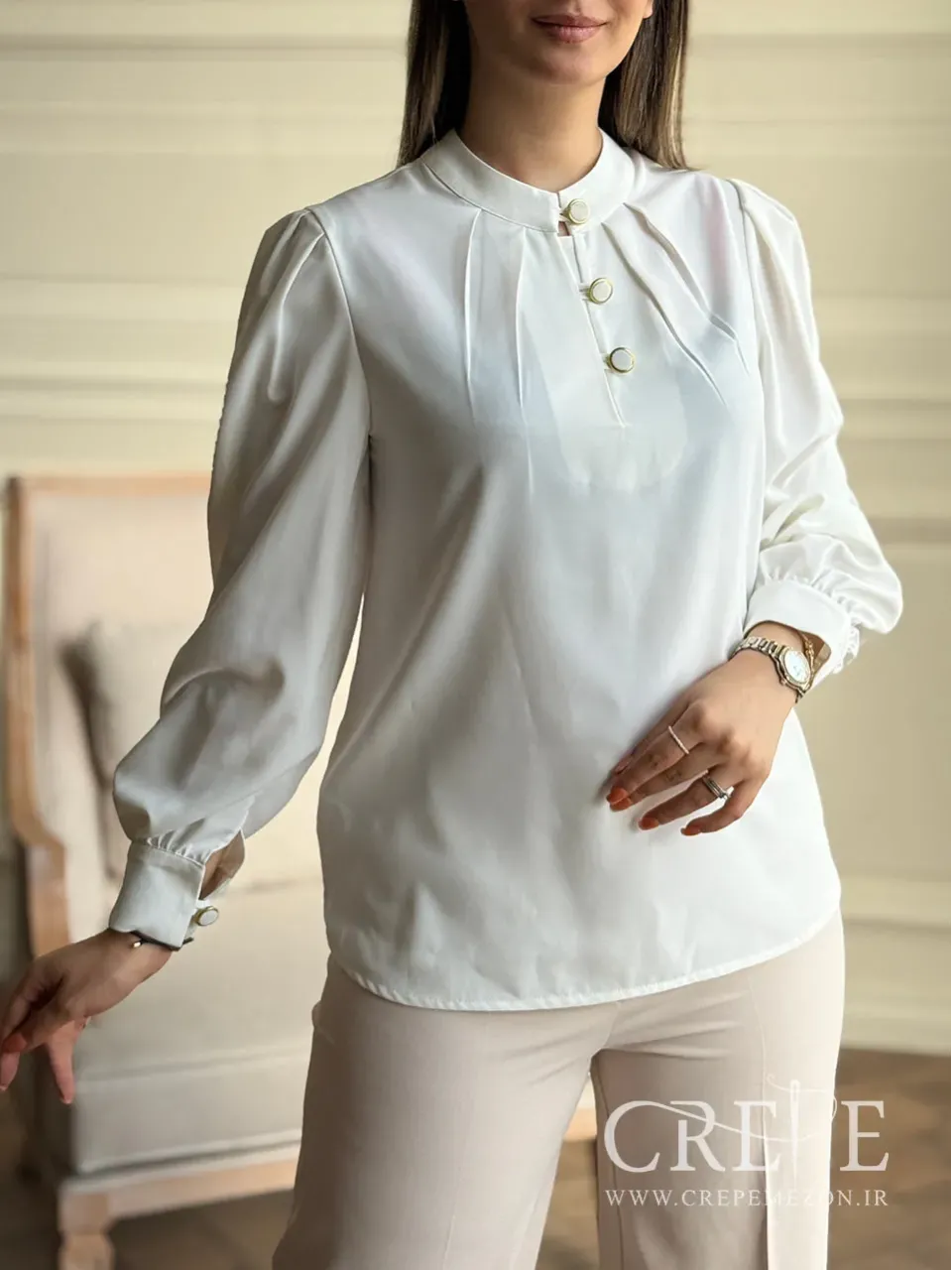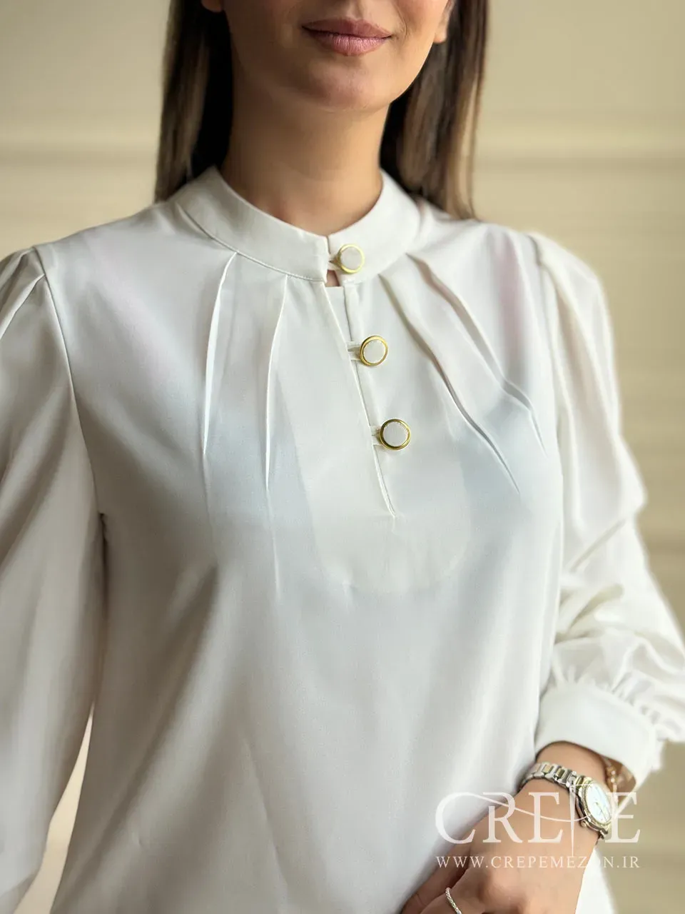 همانطور که در تصویر می بینید سرشانههای فرمدار نشاندهندهی برش دقیق و حرفهای این شومیز یقه پیله دار است. رنگبندی سالید و پارچه بدون پترن آن باعث می شود تا گزینه ایده آلی برای زیر کت محسوب شود و هماهنگی یک کت و شلوار را تضمین کند. دارای یقه گرد سادهای است که بر روی سادگی این مجموعه تاکید دارد. چند دکمه در قسمت جلوی شومیز قرار دارند که علاوه بر عملکردی بودن، جلوه زیبایی نیز ایجاد کردهاند. همچنین این دکمه های طلایی استایل کلی شومیز را مجلسی و مدرن ساخته است. مناسب موقعیتهای رسمی مانند جلسات کاری، مهمانیها یا ملاقاتهای اداری طراحی شده است. ضمن اینکه جزئیات کوچکی همچون دوخت های دقیق دور آستین ها، پیله ها و دکمه های یقه مشخص کننده کیفیت بالای محصول می باشد.