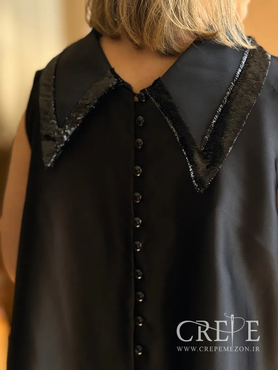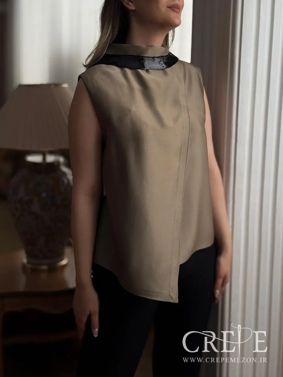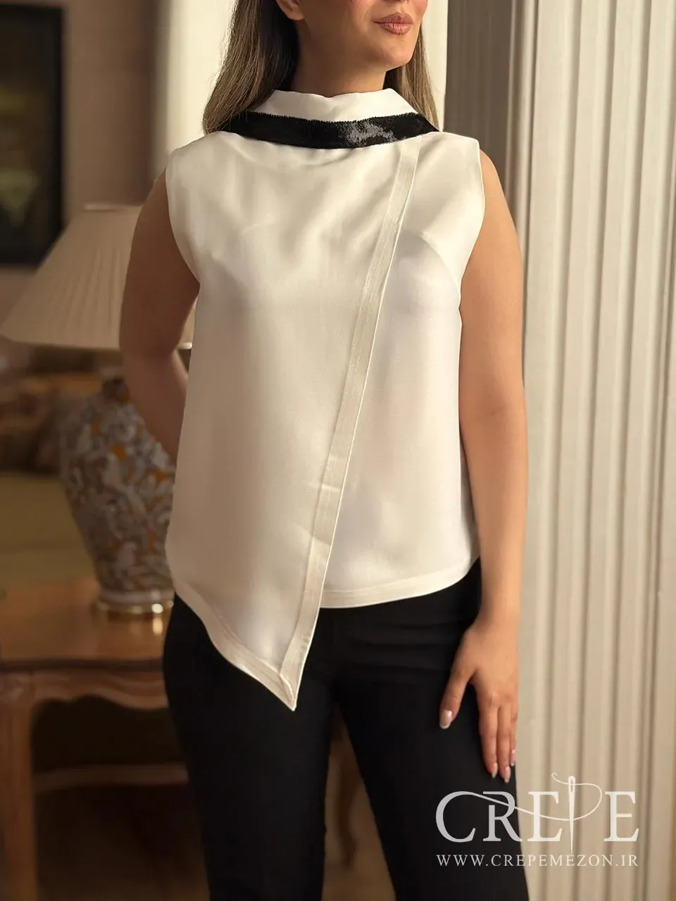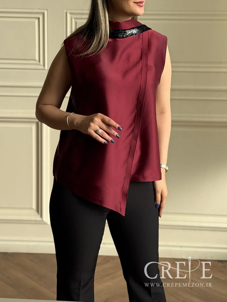 تاپ مجلسی پشت خرگوشی یک تاپ زنانه شیک که از جنس ساتن می باشد و تزیینات یقه آن باعث شده است تا کار از سادگی درآمده و یک تاپ مینیمال و در عین حال مدرن باشد.