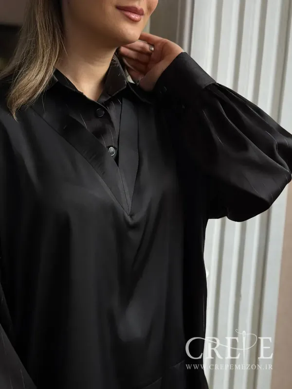 آستینهای این شومیز ترکیبی بلند و مچی هستند که در عین زیبایی، به شما امکان آزادی حرکت میدهند. طراحی آستینها به گونهای است که میتواند به سادگی با هر نوع استایلی هماهنگ شود. قد بلند شومیز به شما این امکان را میدهد که آن را با انواع شلوارها، دامنها یا حتی شلوارکها ست کنید و ظاهری متناسب و خوشفرم به خود ببخشید. رنگ مشکی این شومیز باعث میشود که آن را به راحتی با دیگر لباسها و اکسسوریها ترکیب کنید و برای مناسبتهای مختلف، از مهمانیها گرفته تا مراسم رسمی، مناسب باشد. این شومیز ترکیبی در سایزبندیهای 38 تا 44 عرضه میشود که امکان انتخاب سایز مناسب را برای افراد با اندامهای مختلف فراهم میکند.