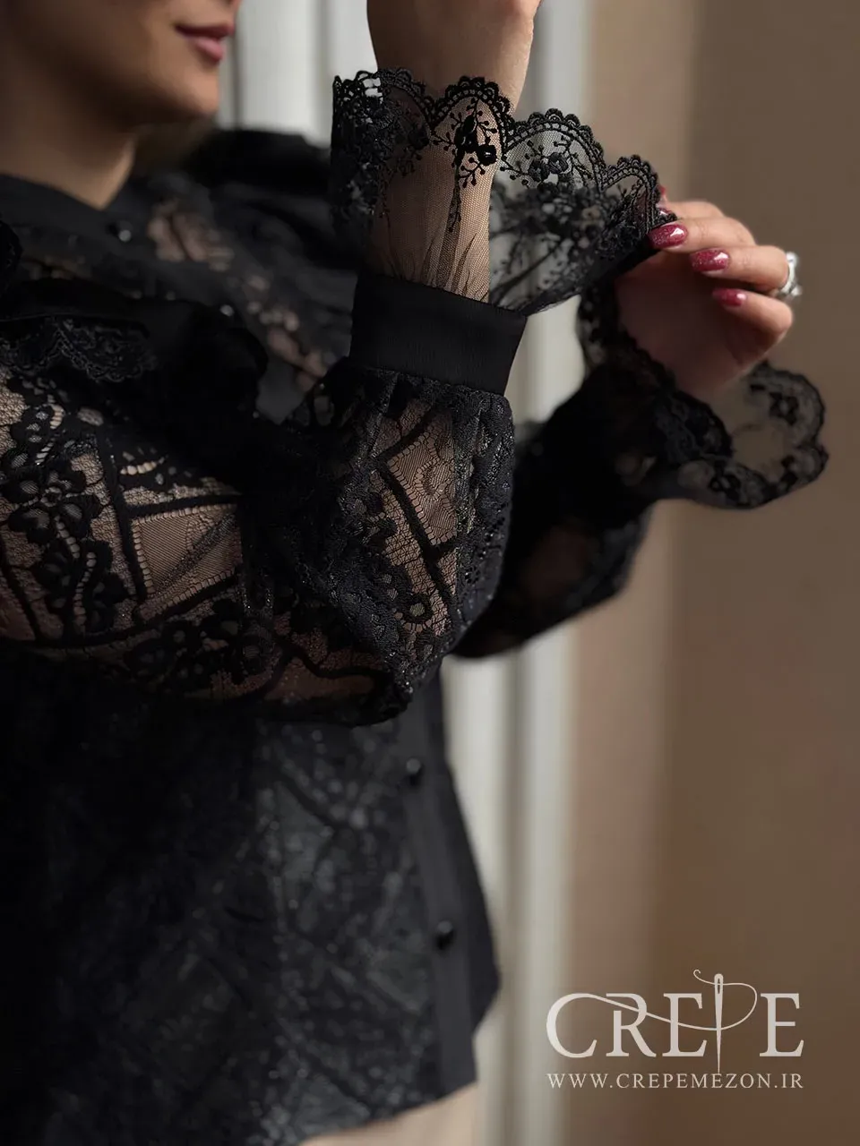 این بخش با یک لایهی نازک طراحی شده تا طرح دانتل بهخوبی جلب نظر کند، اما همچنان پوشانندگی قابل قبولی دارد. چینهای نواری روی سینه از جنس ساتن بوده که حالت تزئینی ایجاد کرده و مثل یک لایهی چیندار از سمت سینهی چپ تا سمت راست امتداد مییابند. وجود این لایهها، علاوه بر ایجاد حجم و فرم جذاب، جلوهی سلطنتی و شکوهمندی به شومیز دادهاند. جلو دکمه بودن این شومیز زنانه همخوانی زیبایی با طرح چین های جلوی لباس ایجاد کرده و انسجام کلی طراحی را حفظ میکند. قسمت بالایی آستینها از جنس تور و دانتل است تا با بخش جلوی بالاتنه هماهنگی سبکی داشته باشد و حس ظرافت و زنانگی را افزایش دهد.