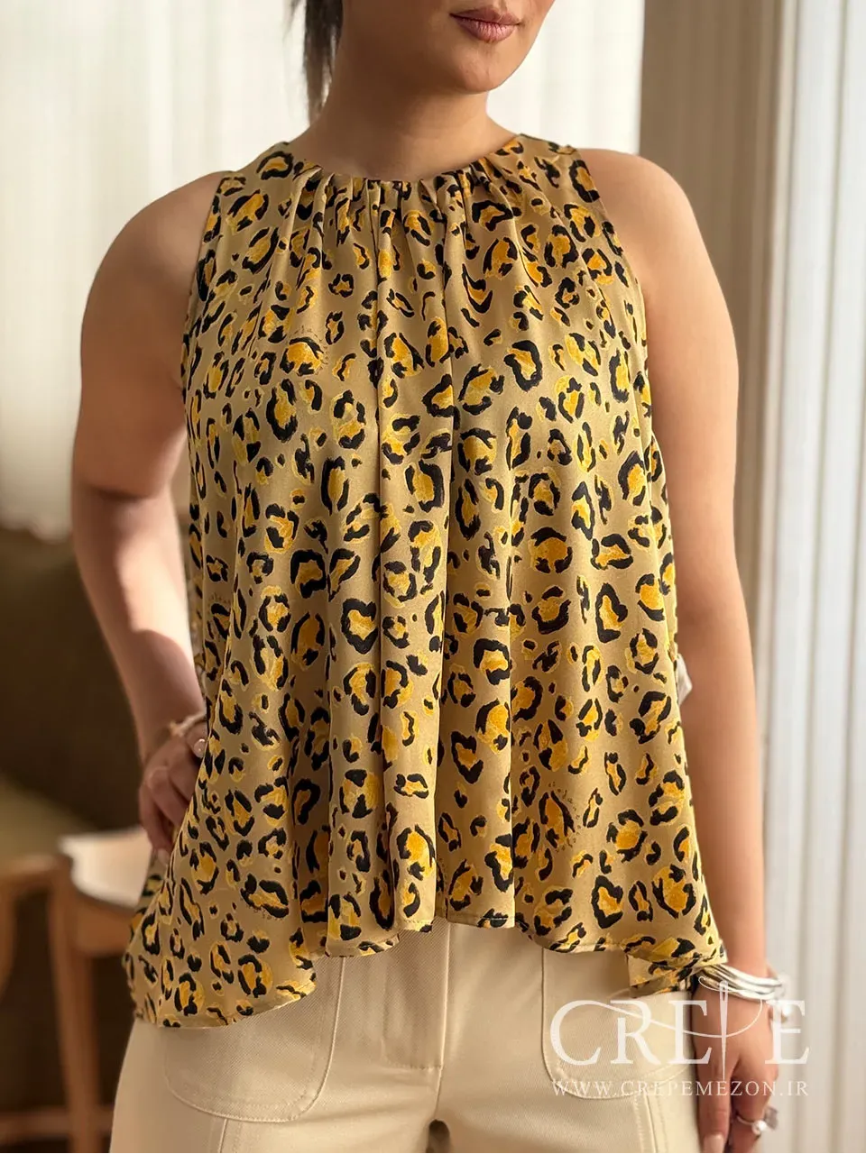 تاپ یقه چین پلنگی یک تاپ مجلسی زیبا که از جنس ساتن بوده و گزینه ایده آلی برای استایل های مجلسی و حتی کژوال می باشد. این تاپ زیبا در رنگ زرد کرم موجود است.