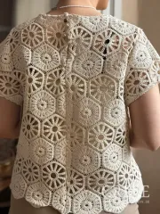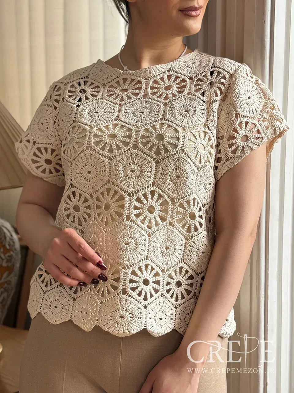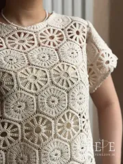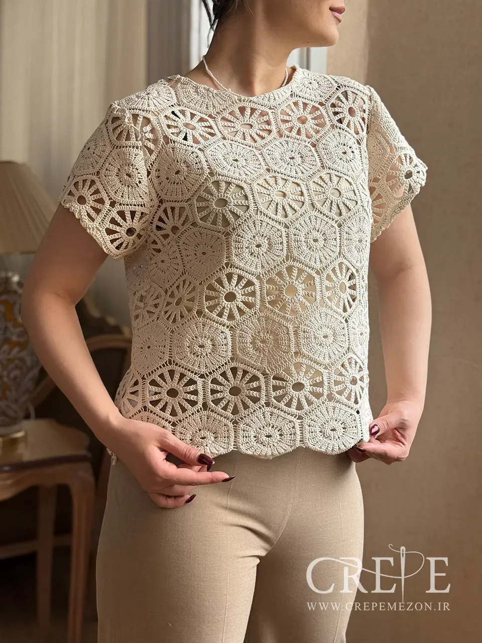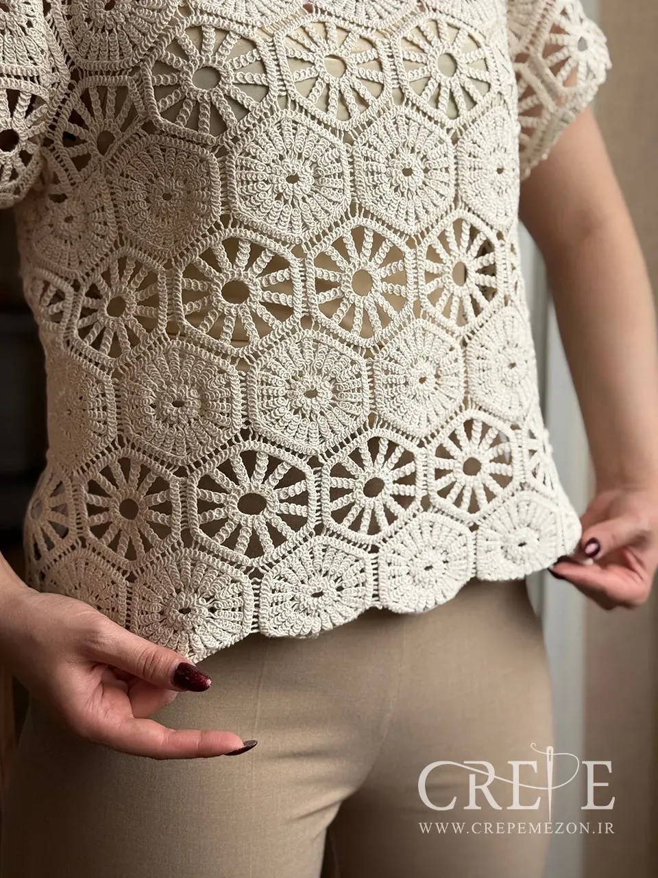 آستین های این شومیز قلاب بافی دوتیکه به صورت کوتاه طراحی شدهاند که این ویژگی باعث میشود شومیز برای فصلهای گرم سال یا مناسبتهای غیررسمی مناسب باشد. آستینهای کوتاه همچنین به راحتی حرکات دست کمک میکنند و احساس راحتی بیشتری را ایجاد میکنند. طرحهای هندسی که در این شومیز به کار رفتهاند، زیبایی و جذابیت خاصی به آن میبخشند. این طرح ها میتوانند شامل اشکال مختلفی باشند که به صورت متقارن در کنار هم قرار گرفتهاند و ظاهر زیبا و در عین حال متفاوتی به شومیز داده است.