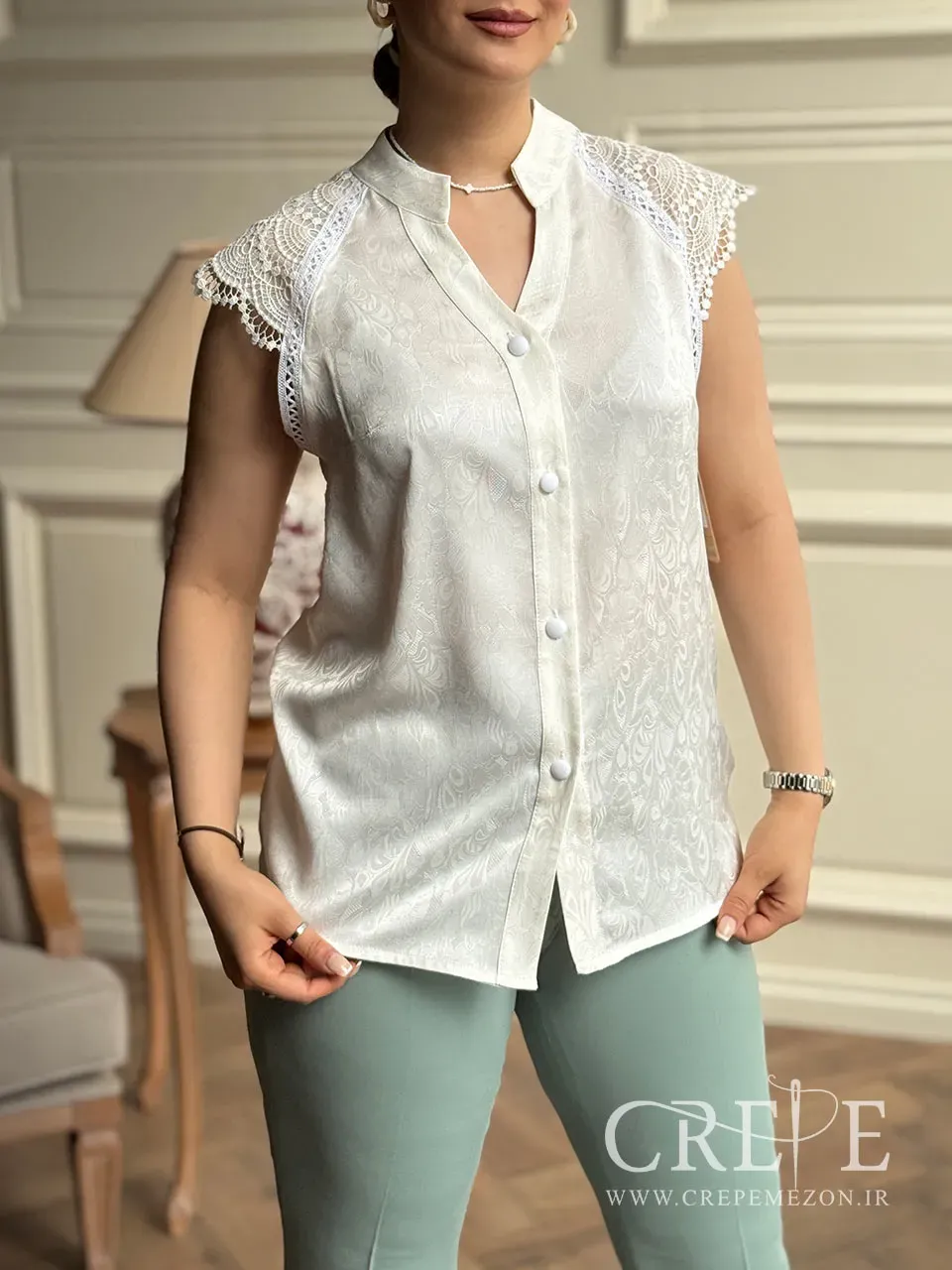 تاپ سرشانه دانتل یک تاپ مجلسی زیبا که از جنس ساتن طرحدار بوده و سرشانه آن با دانتل طراحی شده است. این تاپ زیبا برای زیر کت، استایل با دامن و شلوار عالی است.