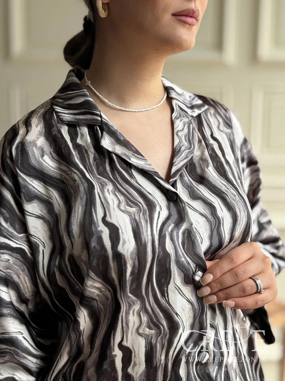این شومیز مجلسی از جنس ساتن دوخته شده است، که براقیت و لطافت خاصی دارد و ظاهری لوکس و مجلسی به آن میدهد. ساتن به دلیل درخشندگی و نرمی، گزینهای عالی برای مجالس و مهمانیها است. طرح روی این شومیز به صورت انتزاعی است، یعنی الگوهای غیر مشخص و هنری که حس هنر و مدرن بودن را منتقل میکند. این نوع طرحها به راحتی با سایر لباسها و اکسسوریها ست میشود و استایلی خاص و منحصر به فرد ایجاد میکند. همچنین سایزبندی آن 46-40 است که برای همه فرم های بدنی مناسب است.