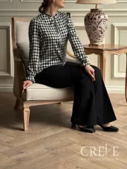 در قسمت یقه و سرمچها، دکمههای تزیینی طلایی قرار گرفته است. این دکمهها علاوه بر کاربردی بودن، نقش زینتی دارند و زیبایی لباس را دوچندان میکنند. آستینهای این شومیز بلند و مچی هستند، که ظاهری شیک و رسمی به لباس میبخشند و مناسب برای مجالس و مراسم رسمی است. این شومیز در سایزهای 40 تا 46 موجود است، بنابراین گزینههای متنوعی برای تناسب با اندازههای مختلف دارد. این شومیز با طراحی خاص، جنس لوکس و جزئیات تزیینی طلایی، گزینهای عالی برای مجالس و رویدادهای رسمی است.