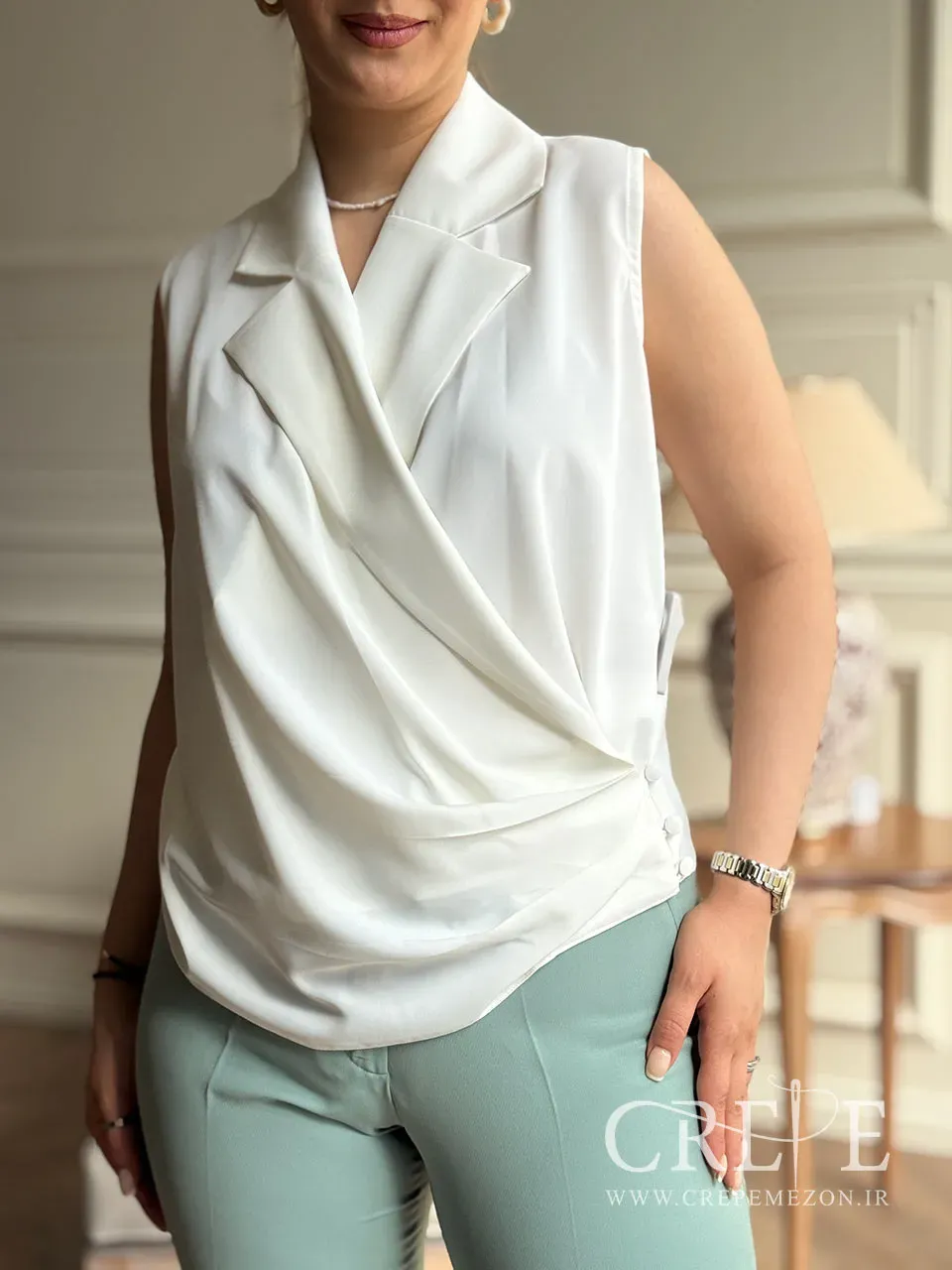 برای استایل کردن یک تاپ مجلسی با طراحی یکطرفه دکمه دار میتوانید نکات زیر را در نظر بگیرید تا ظاهر شیکی داشته باشید. از یک لایه نازک و بدون طرح یا با رنگ همرنگ تاپ استفاده کنید تا خطوط زیرین مشخص نباشد. اگر یقه انگلیسی دارید، مطمئن شوید که زیر لباس زیر، لایهای سبک و بینقص است. چون طراحی خاص است و دکمهها در طرفین قرار دارند، بهتر است آن را روی یک شلوار یا دامن ساده و کلاسیک بپوشید. برای رنگ سفید، میتوانید آن را با شلوار یا دامن مشکی، سرمهای یا رنگ خنثی دیگر ست کنید.