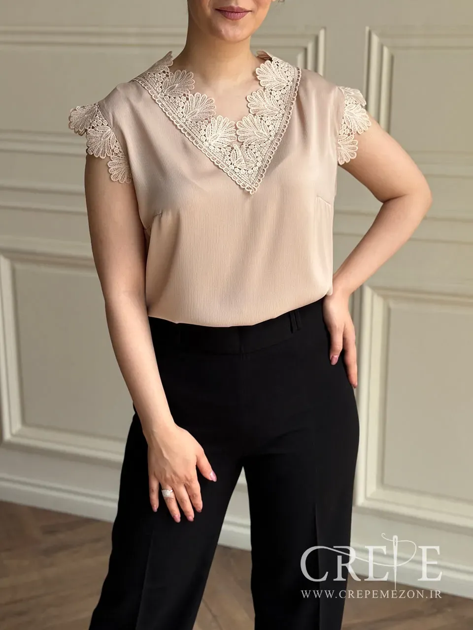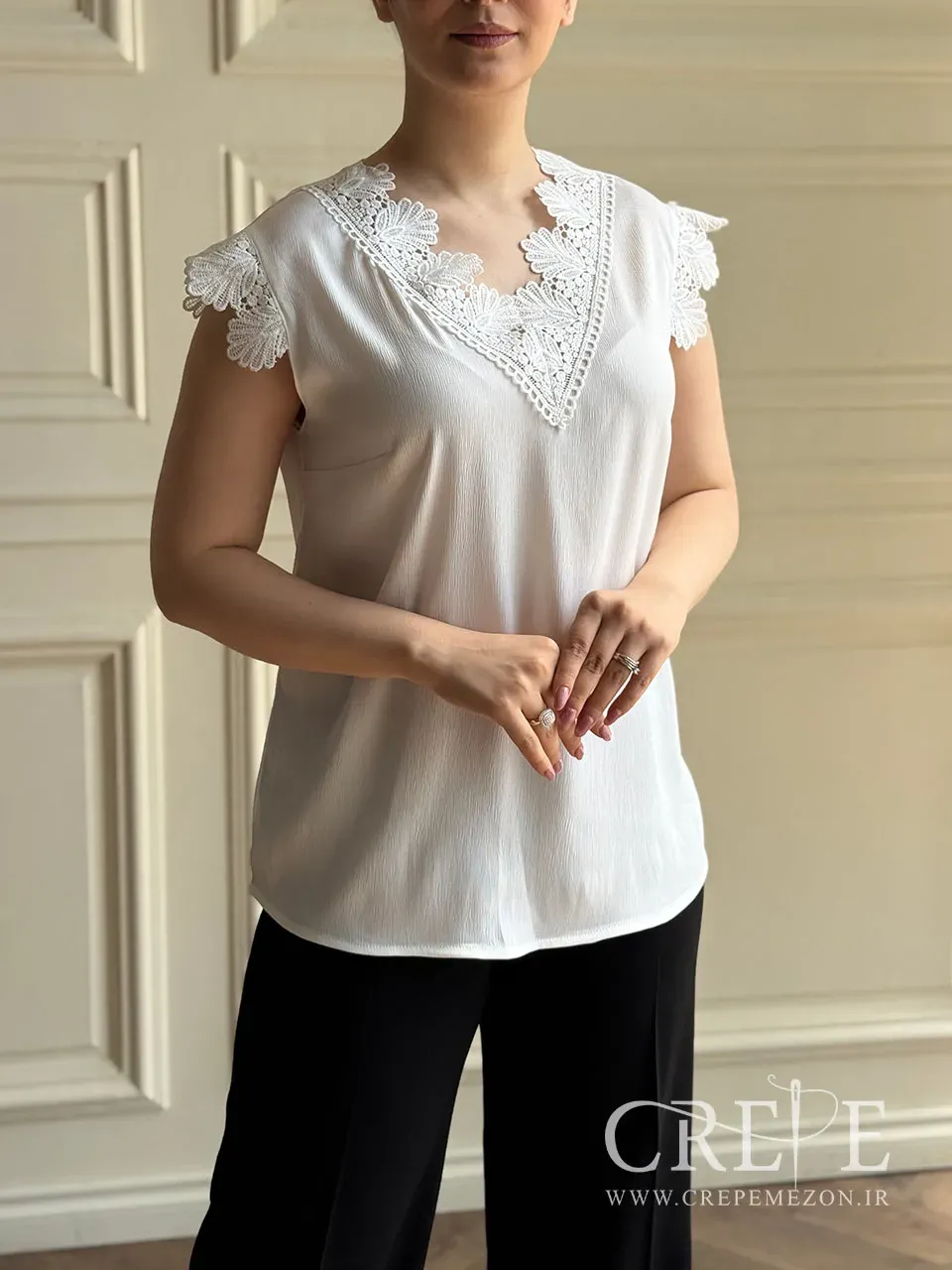 تاپ یقه هفت پشت گیپور با طراحی خاص و لطافت بالای آن، گزینهای مناسب برای مناسبتهای مختلف است.