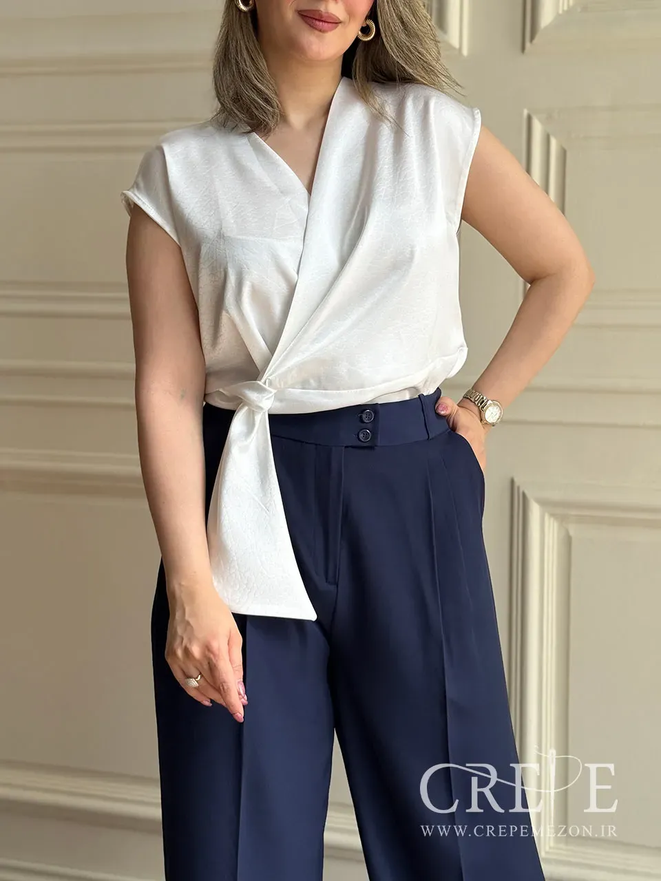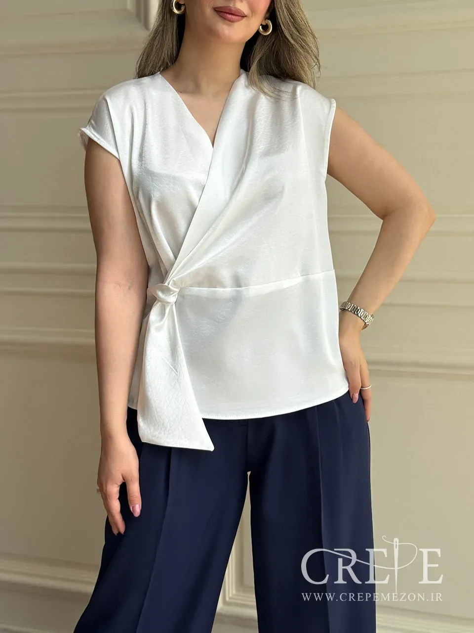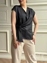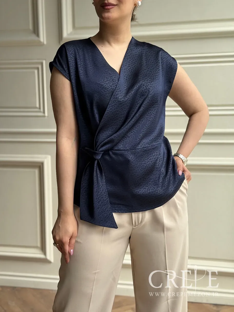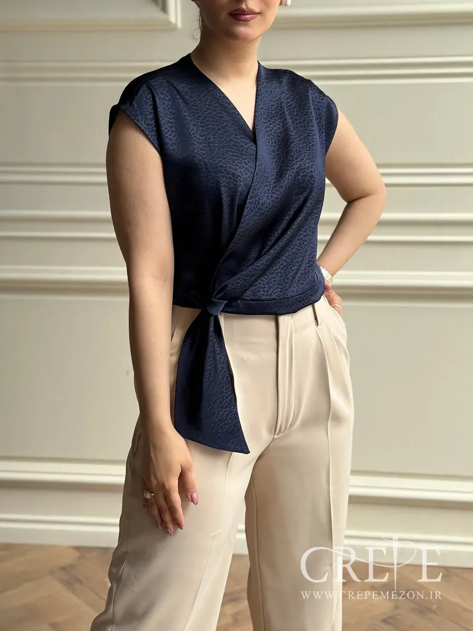 این شومیز مجلسی با جنس ساتن و طرح بغل گرهای، به تنهایی بسیار جذاب است، پس میتوانید آن را با یک جلیقه کوتاه یا کت براق ست کنید.