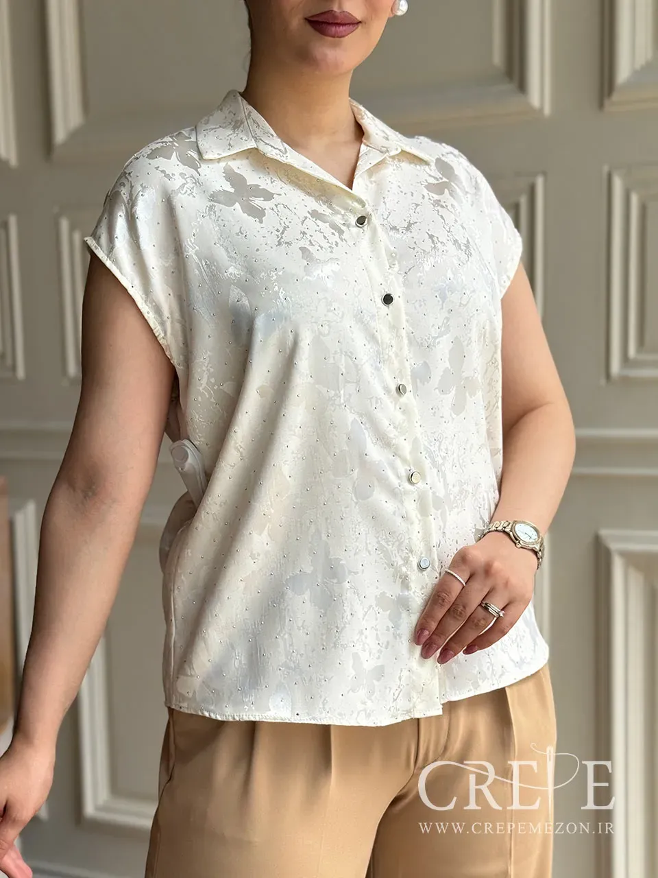 تاپ نگینی طرح پروانه یک تاپ مجلسی با طراحی پرلطافت که از جنس ساتن طرحدار بوده و دارای نگین های ریز می باشد. این تاپ زیبا در رنگبندی مشکی و نباتی موجود است.