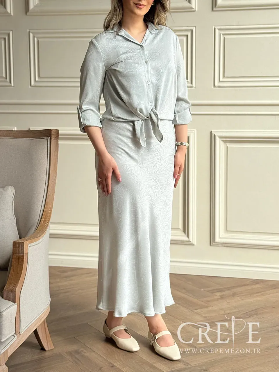 شومیز دامن طرح اسلیمی یک ست مجلسی دلربا که از جنس کریشه لمه بوده و از ریزش، خنکا و وزن سبکی برخوردار است. این ست برای مهمانی و استایل شیک روزانه عالی است.