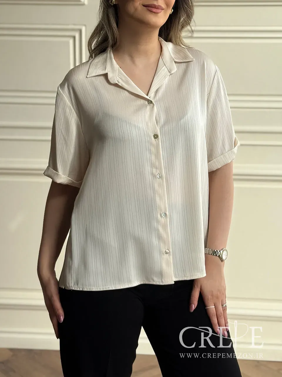 شومیز آستین کوتاه راه راه یک شومیز مجلسی مینیمال که از جنس حریر کریشه می باشد. این سبک شومیز را بهتر است با شلوارهای پارچه ای مام یا بوتکات استایل کرد.