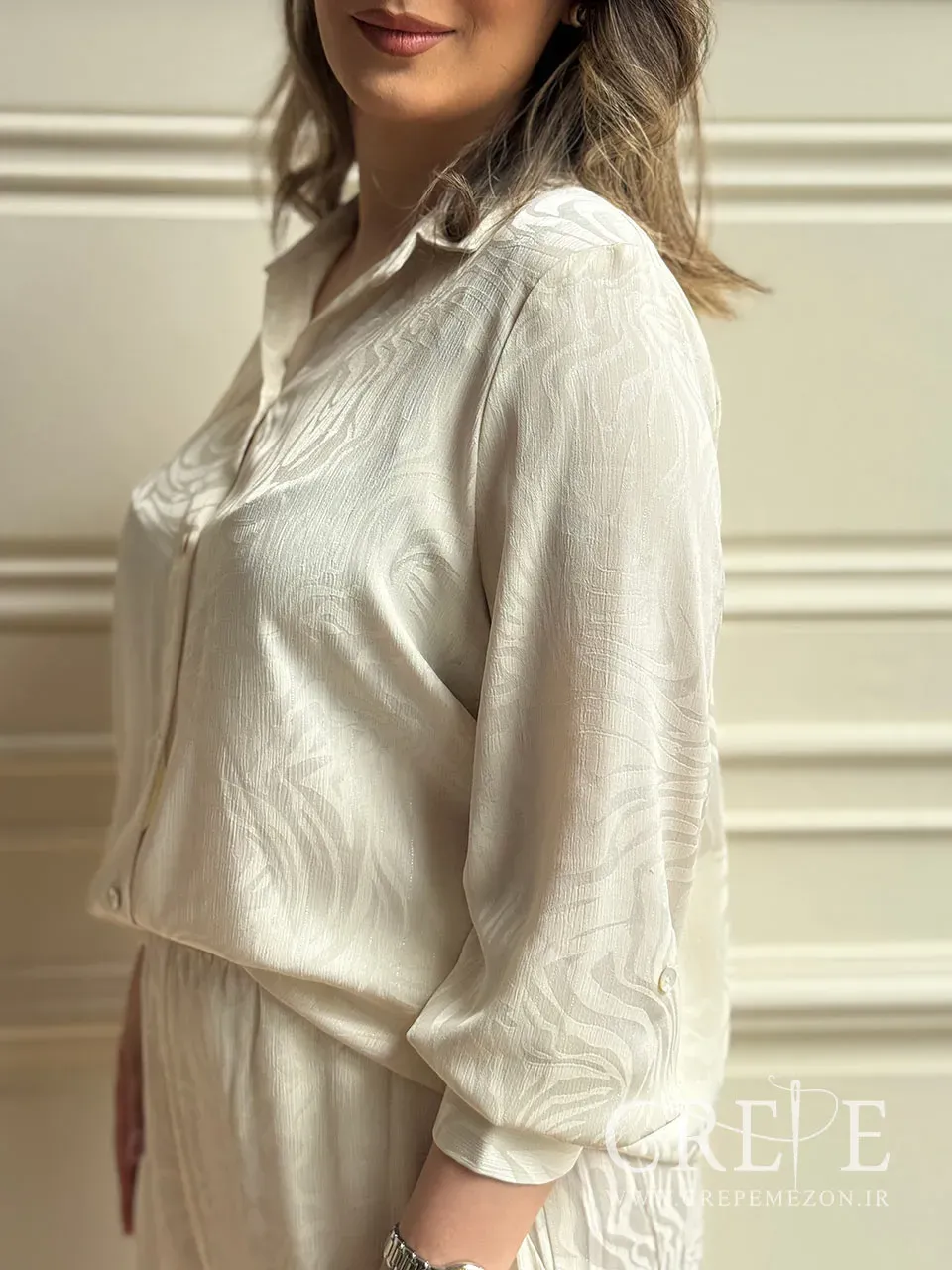 شومیز شلوار طرح زبرا یک ست مجلسی زیبا که از جنس پارچه کریشه لمه طرحدار بوده و با طراحی خاص و جذاب، برای خانمهایی که به استایلهای مدرن و شیک علاقهمند هستند، مناسب است. شومیز دارای برش جلودکمه است که ظاهری کلاسیک و در عین حال مدرن به آن می بخشد. آستینهای بلند با قابلیت تنظیم قد دارند. در قسمت بازو، دکمه و بند قرار گرفته است که امکان کوتاه کردن آستین ها را فراهم می کند، بنابراین می توانید استایل خود را به دلخواه تغییر دهید. جنس پارچه این ست محلسی کریشه لمه طرحدار است که با طرح زبرا که به زیبایی خط های راه راه و طرح های زبرا را نشان می دهد، دارد.
