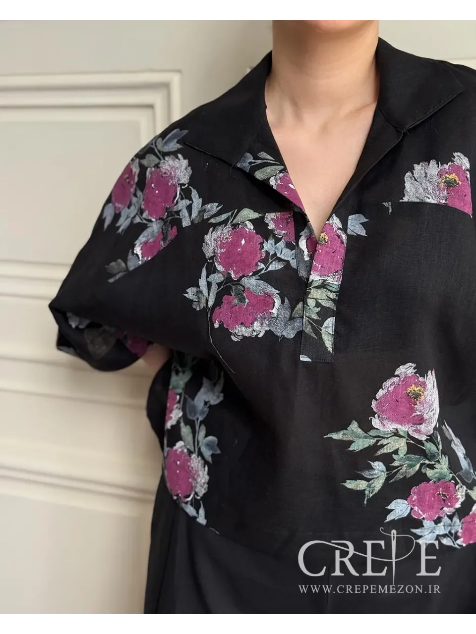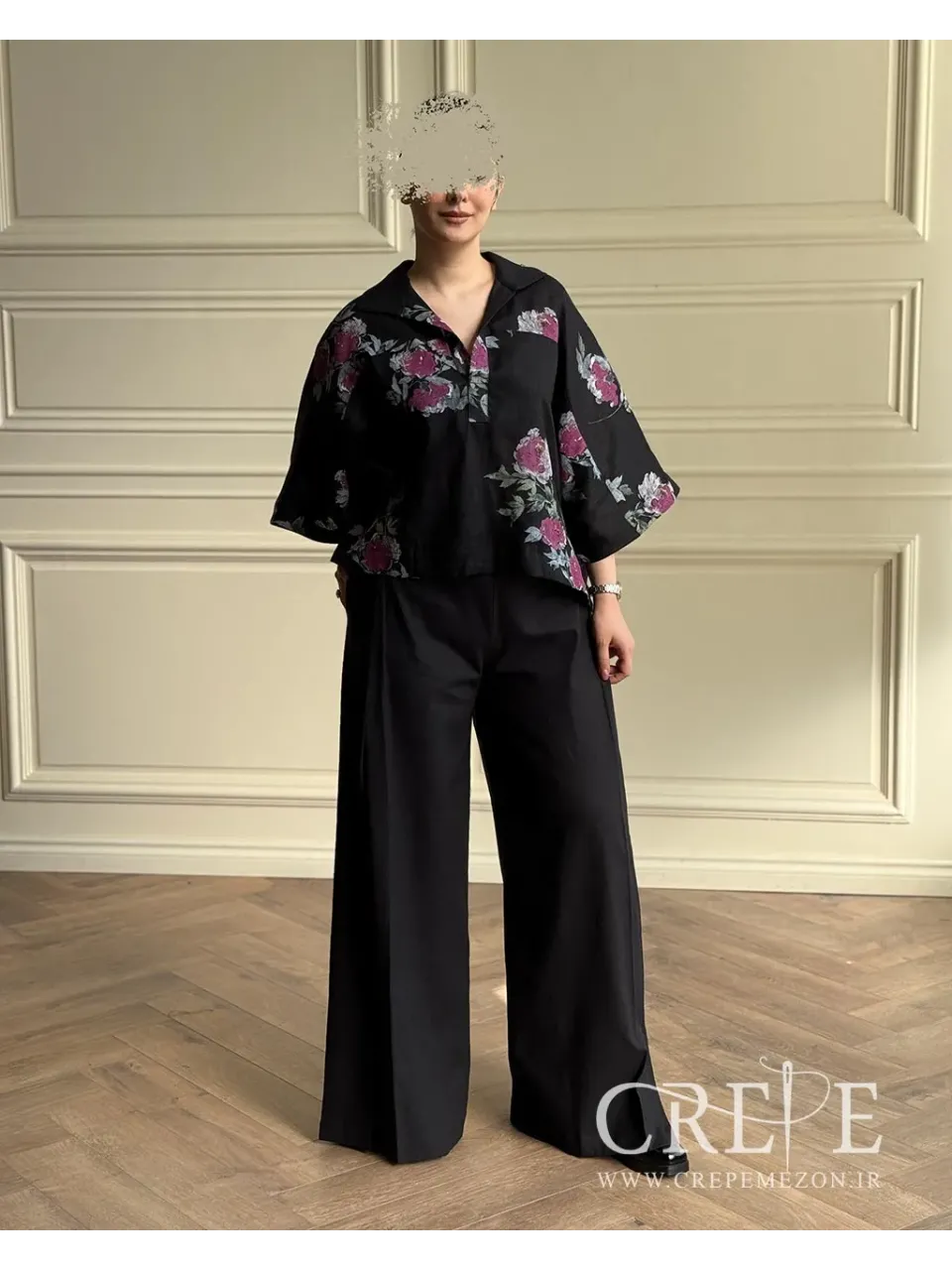 شومیز دارای طرح گلدار بر روی پارچه است که جلوهای زنده و جذاب به لباس میبخشد. آستینهای آن سه ربع است، یعنی تا حدود سهچهارم ساعد، که مناسب برای هوای معتدل است و ظاهری شیک و راحت دارد. دودکمه بر روی یقه و جلوی لباس قرار دارد، که به راحتی لباس را باز و بسته میکند و استایل آن را متفاوت میسازد. شلوار مدل بگ طراحی شده است که کمی گشاد و راحت است و آزادی حرکت را فراهم میکند. همچنین کمر کش دارد، یعنی قابلیت تنظیم و راحتی در استفاده را فراهم میکند.