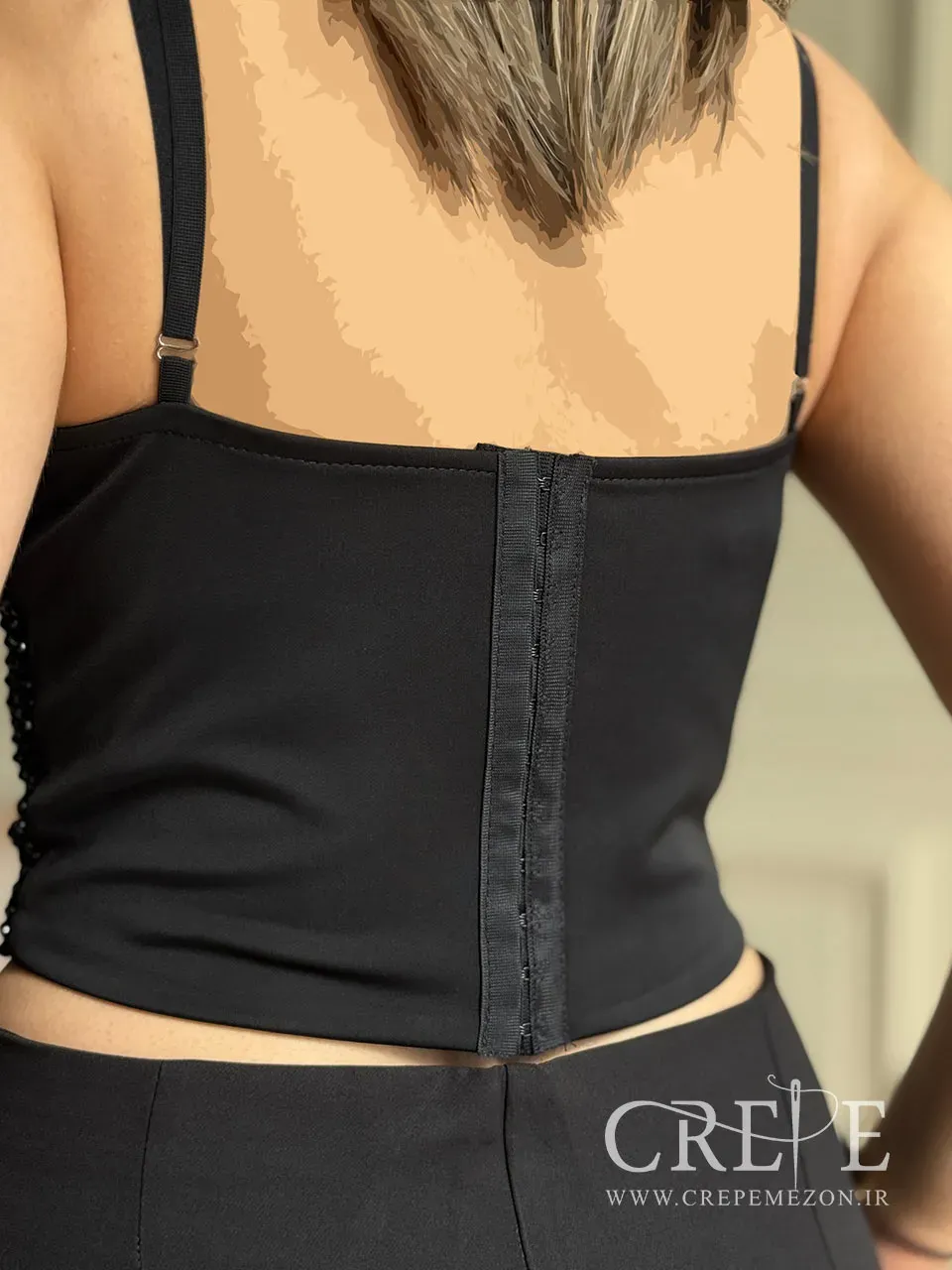 قزن گنی در قسمت پشت برای تنظیم سایز قرار دارد، که امکان تنظیم راحت و مناسب سایز بدن را فراهم میکند و از نظر راحتی و تناسب اهمیت زیادی دارد. رنگ اصلی این تاپ مشکی است که رنگی کلاسیک و همیشگی برای لباسهای مجلسی است. روی سینهها، سنگ دوزیهای فراوانی انجام شده است که زیبایی و لوکسی لباس را افزایش میدهد. سنگ دوزیها نیز به رنگ مشکی هستند، که با رنگ پارچه هماهنگ بوده و ظاهری یکدست و شیک به لباس میبخشد. وجود بندهای اضافی و قزن تنظیم سایز، باعث میشود این تاپ هم برای افراد با سایزهای مختلف مناسب باشد و بتوان آن را به صورت دلخواه تنظیم کرد.