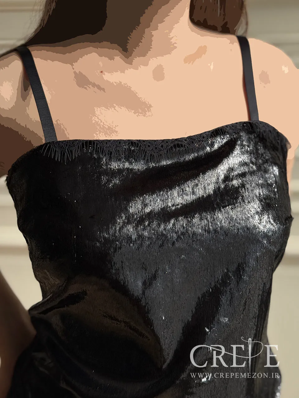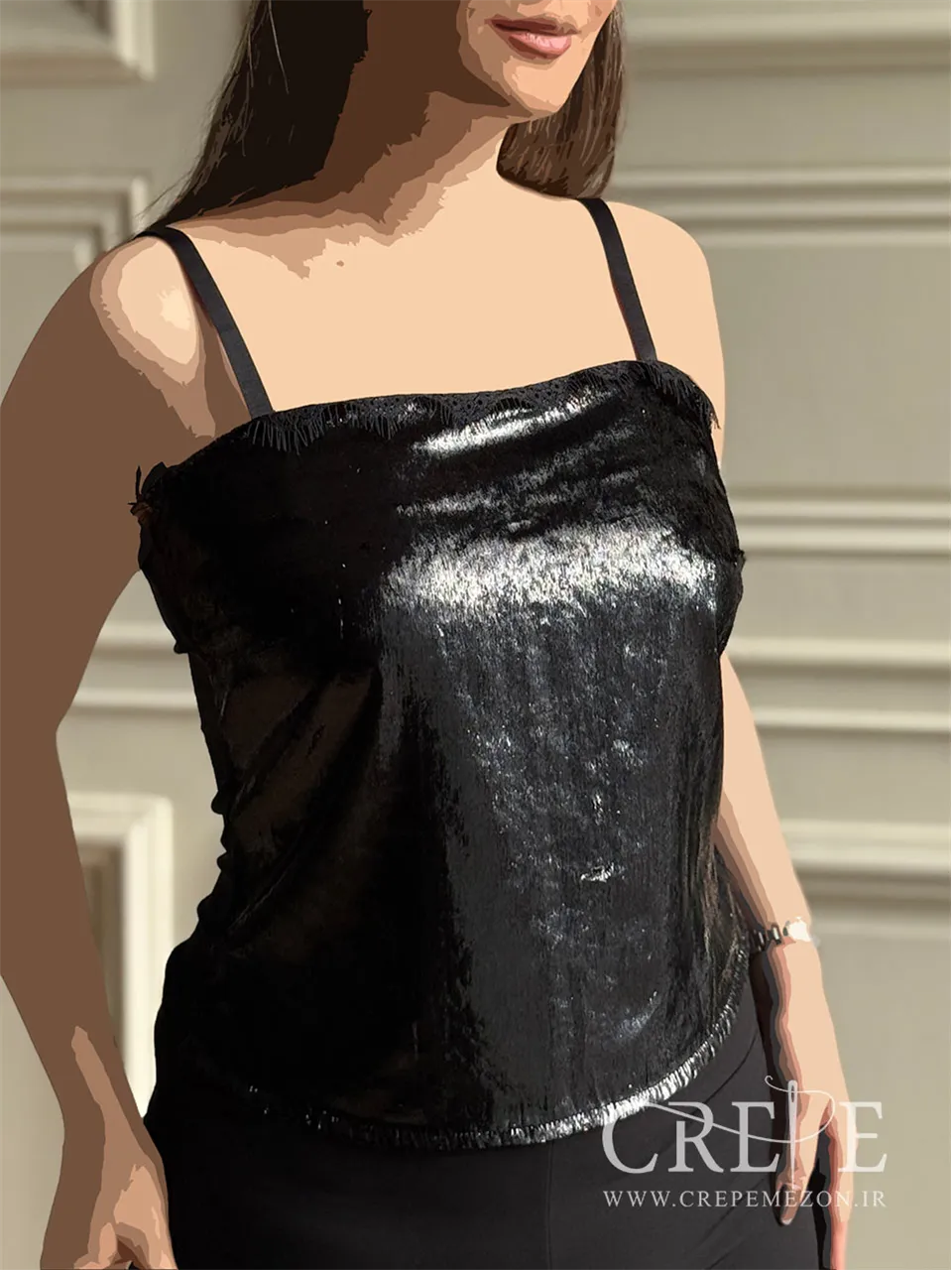 تاپ شاین دوبنده یک تاپ مجلسی زیبا که از جنس پارچه ریش بابا طرح چرم بوده و در رنگ مشکی و سایزبندی 44-38 موجود شده است. پشت این تاپ مجلسی از جنس ریون می باشد.