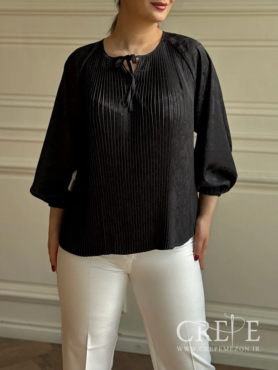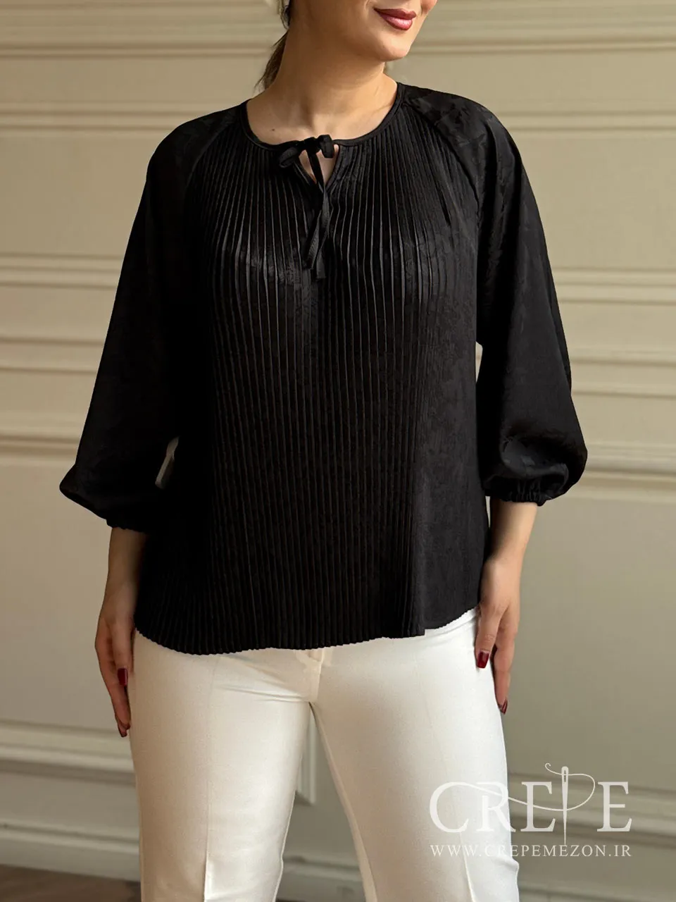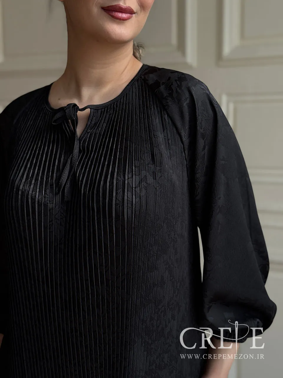 شومیز پلیسه یقه گره یک شومیز مجلسی خیلی شیک که از جنس ساتن ژاکارد بوده و در سایزبندی 44-38 و رنگ مشکی موجود شده است. این شومیز جلوه فوق العاده ای در تن دارد.