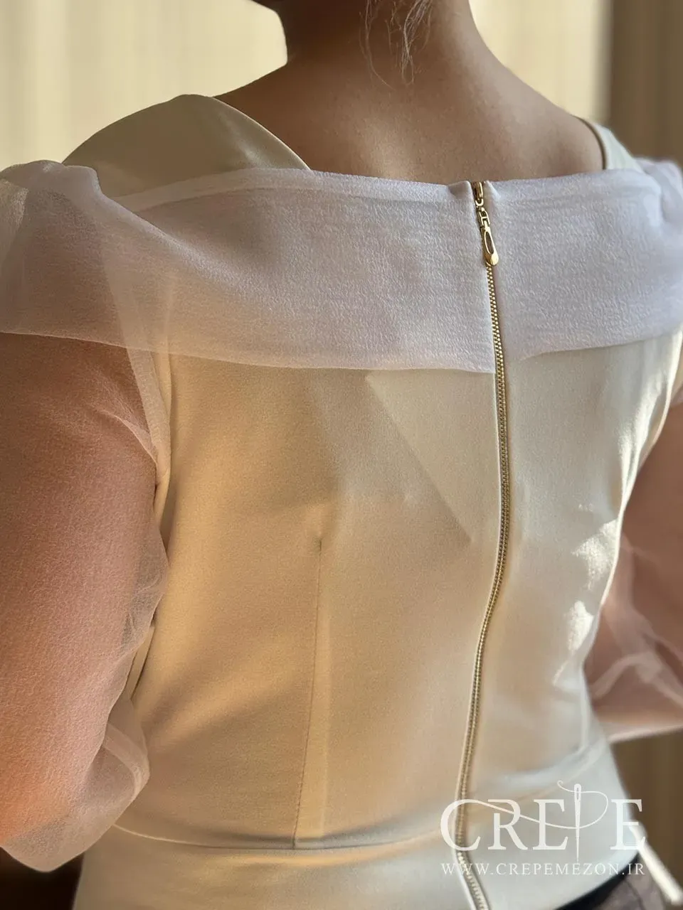 آستینهای این شومیز یقه پاپیونی نیز دارای طراحی خاصی هستند. آستینها بلند بوده ولی از قسمت سرشانه تا مچ دست از جنس تور شفافی هستند که نمایانگر پوست بدن زیر آنهاست. این تورها ضمن افزودن حس لطافت و زنانگی بیشتر، تضادی زیبا با بخشهای دیگر لباس ایجاد کردهاند. مچ آستینها نیز به صورت بسته دوخته شدهاند تا تناسب کامل با باقی قسمتهای آستین حفظ شود. بخش جلویی بدن تا کمر دوخت سادهای دارد اما فیت نسبتاً چسبانی دارد که اندام را خوشفرم نشان میدهد. پارچه استفادهشده برای بدنه اصلی این شومیز پاپیونی هم نوعی کرپ به نام کرپ دالقیچ است که علاوه بر راحت بودن، مقاومت خوبی نیز دارد. این نوع شومیز دیاموند معمولاً برای مراسمات رسمی یا نیمهرسمی مناسب بوده و میتوان آن را همراه با دامن یا شلوارهای متنوع ست کرد تا جلوهای بینقص داشته باشد.