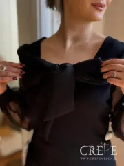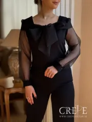 شومیز دیاموند پاپیونی دالقیچ یک شومیز مجلسی شیک از جنس کرپ دالقیچ می باشد که یک نمونه بسیار شیک و مدرن از پوشاک زنانه است. این شومیز دیاموند پاپیونی دالقیچ با رنگ مشکی طراحی شده که به آن جلوهای کلاسیک و همهپسند بخشیده است. بالاتنه این شومیز مجلسی دارای طراحی خاصی است که توجه را به خود جلب میکند. در قسمت یقه، یک پاپیون بزرگ و زیبا قرار دارد که از جنس تور بوده و باعث می شود زیبایی پوست را بیشتر به نمایش گذارد. این پاپیون نه تنها بر زیبایی این شومیز مجلسی افزوده، بلکه آن را به یک آیتم منحصر به فرد تبدیل کرده است که در همان وهله اول نگاه ها را جذب شما می کند. یقه برخلاف اکثر شومیزها بازتر طراحی شده و با قرارگیری پاپیون، حالتی رسمیتر و جذابتر پیدا کرده است.