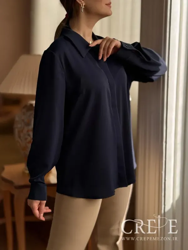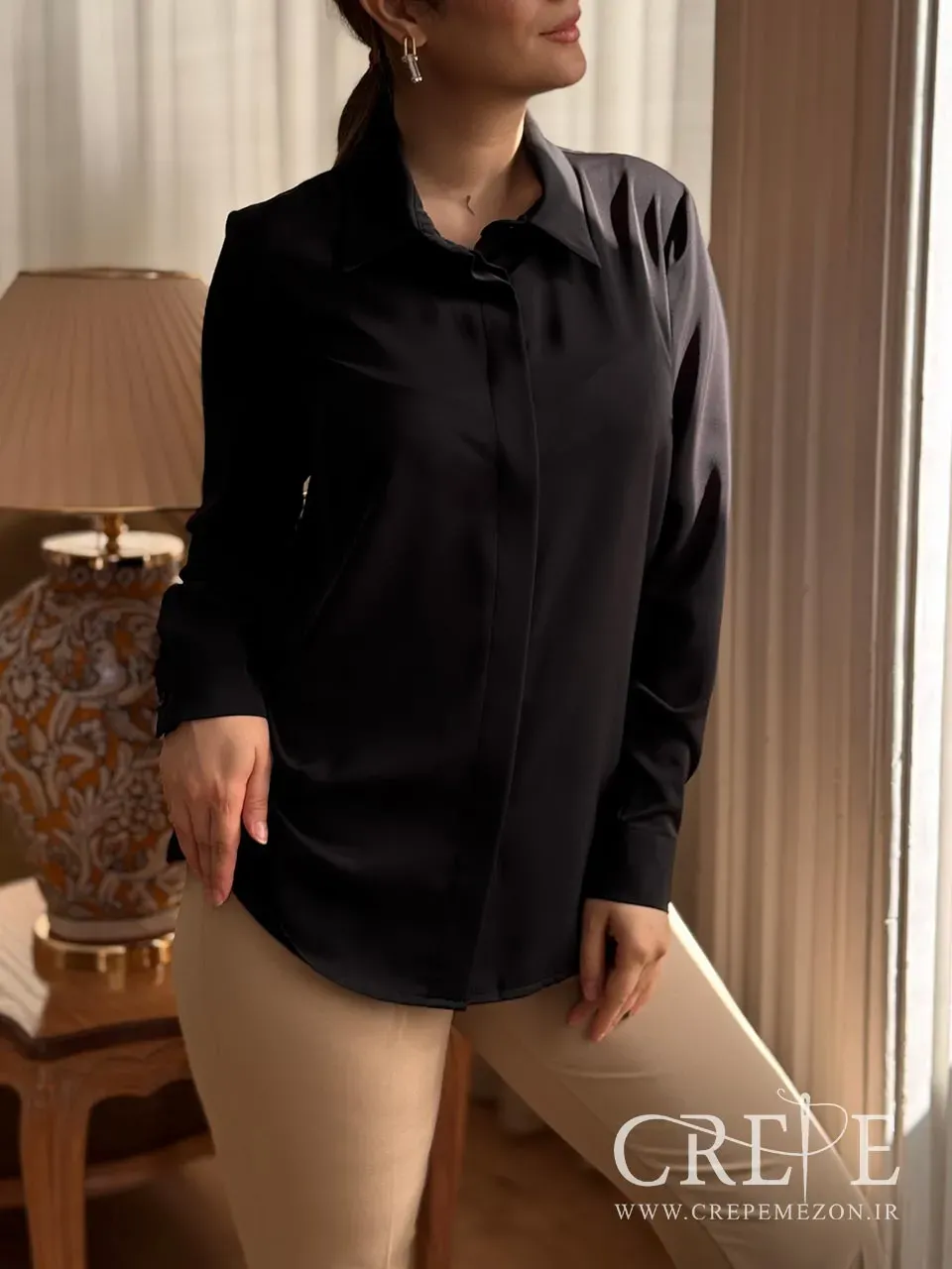 شومیز الیزه یقه مردانه یک شومیز پوشیده از جنس کرپ الیزه که در رنگبندی مشکی، سفید، کرم و سرمه ای موجود است. همچنین از اسنپ پی خرید اقساطی 4 مرحله ای دارد.