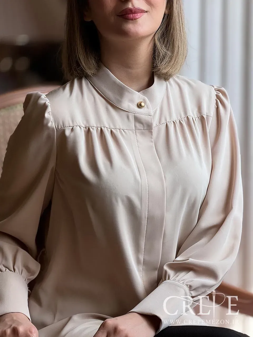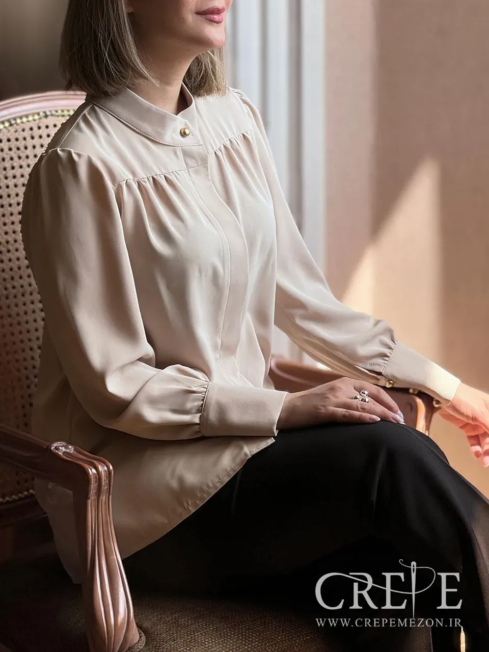 تونیک کمردار کرپ مصری دارای یقه فرانسوی بوده و دکمه های طلایی آن باعث می شود ظاهر مجلسی تری داشته باشد. آستین ها مچی و در قسمت بالاتنه دارای چین سوزنی می باشد تا کار را از سادگی درآورده و چشم ها را درگیر کند. این شومیز بلند با رنگبندی نود و کاربردی که دارد برای تمامی مراسم های پیش رو مناسب بوده و طیف عظیمی از مراسم ها را پوشش میدهد. همچنین همانطور که در تصویر می بینید پوشیده بودن آن باعث می شود در مراسم عقد، مهمانی، دورهمی های خودمانی، کنسرت و حتی مسافرت های خارج از کشور نیز قابلیت استفاده را داشته و اگر با شلوار همرنگ یا هم تنالیته ست شود استایل مونوکروم داشته و شما را کشیده و باریک تر نشان خواهد داد.