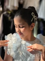 یقه پیراهن گرد سادست و آستین حلقه با یک نوار چیندار بررروی حلقه با مروارید دوخته شده که زیبای خاص روی قسمت شانه و بازو ایجاد کرده