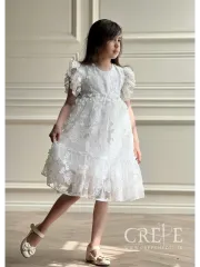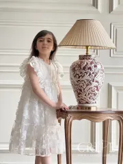 پیراهن دخترونه تور سفید با گلهای بزرگ و کوچیک زیبا که در قسمت پایین دامن یک طبقه چیندار دوخته شده