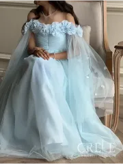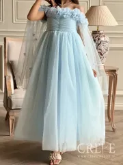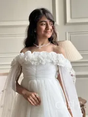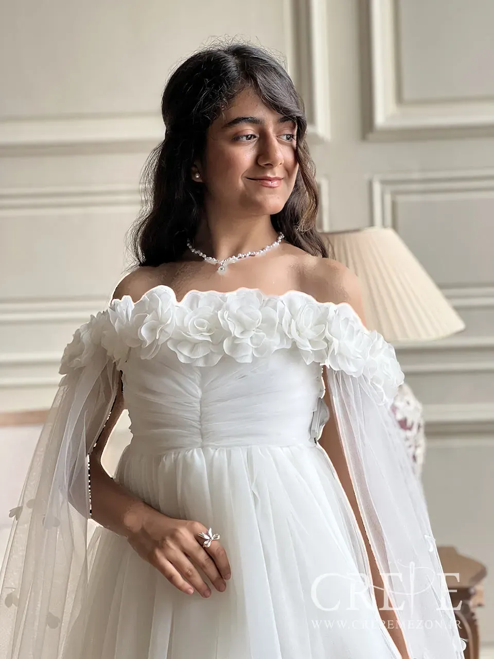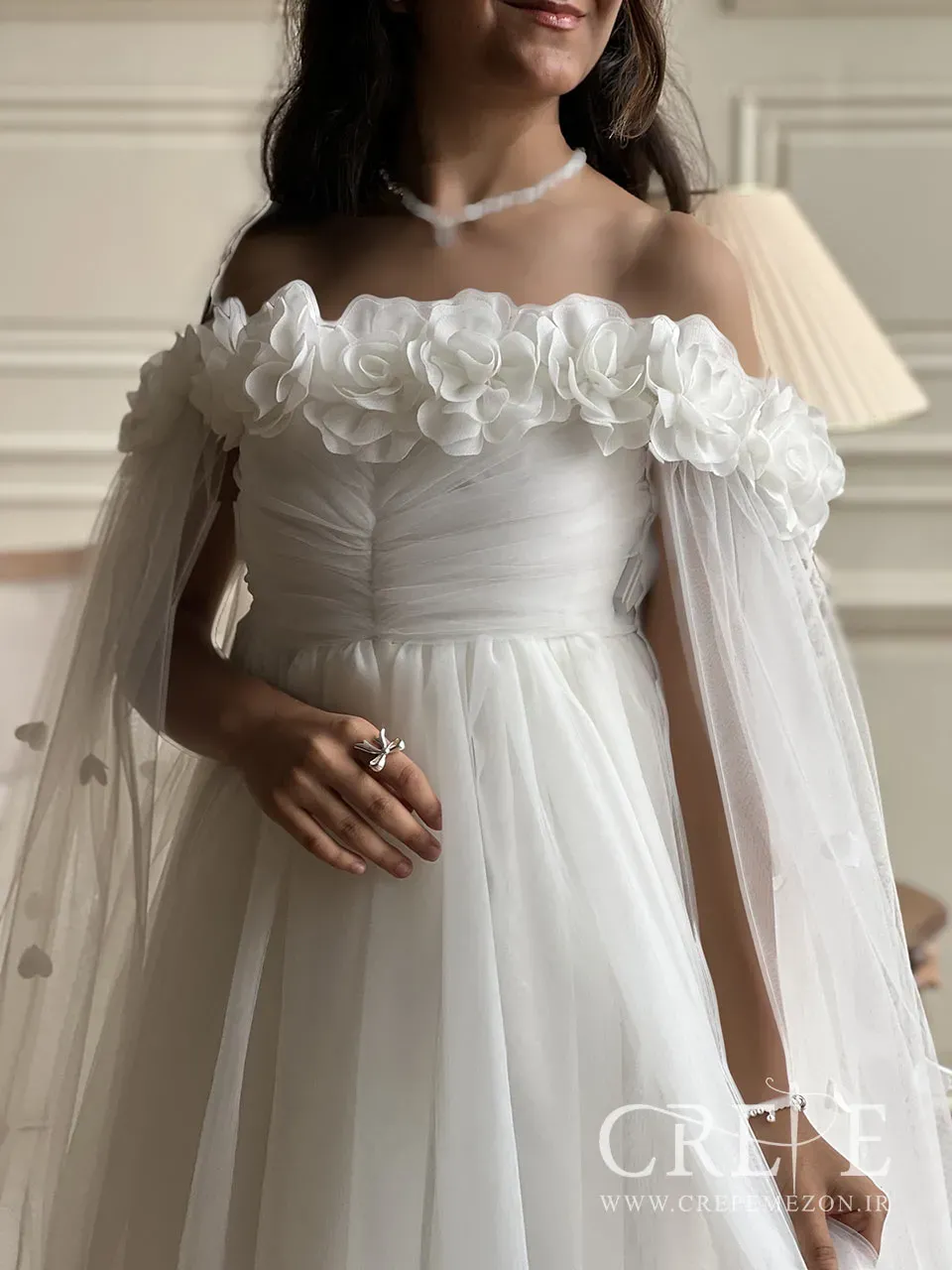 آستین های پیراهن در واقعه حلقه است ولی از قسمت روی بازو که در امتداد یقه است تور برای هم پوشش بازوها وزیباتر شدن کار دوخته شده که با گلبرگ ها دوخته شده زیباترشده