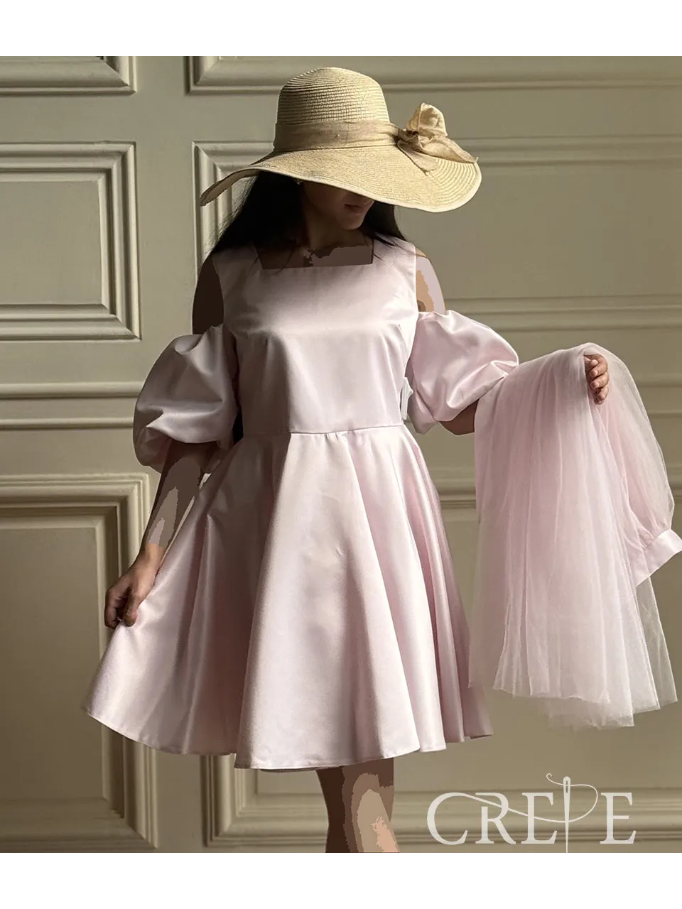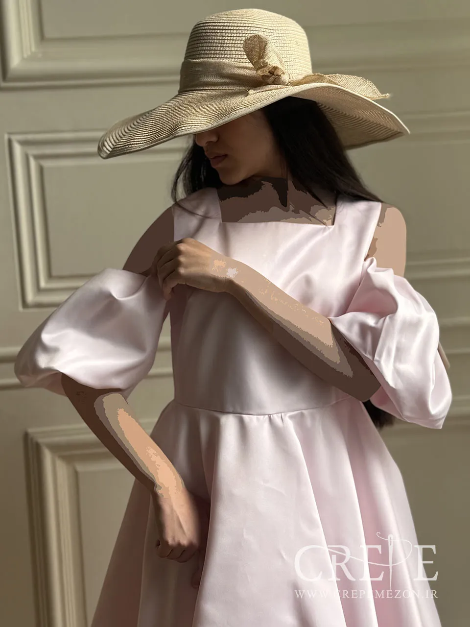 کل پیراهن از جنس ساتن دوخته شده با یک دامن آهار دار پفی که لبه های دور دامن ژیپون دوخته شده تا ایستایی بهتری داشته باشه و آستین پفی که قسمت بازو رو پوشش نمیده و از بازو به بعد دوخته شده ئ بالا ئ پایین آستین کشدوزی شده .
