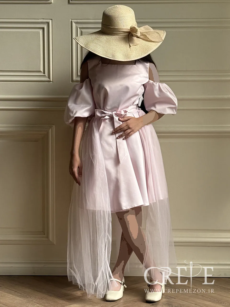 یک تور به عنوان شنل با نواری از جنس خود ساتن دوخته شده که جلو پیراهن پاپیون زده میشه و پیراهن رو مدل پشت بلند میکنه و یک مدل زیبا وخاص شده