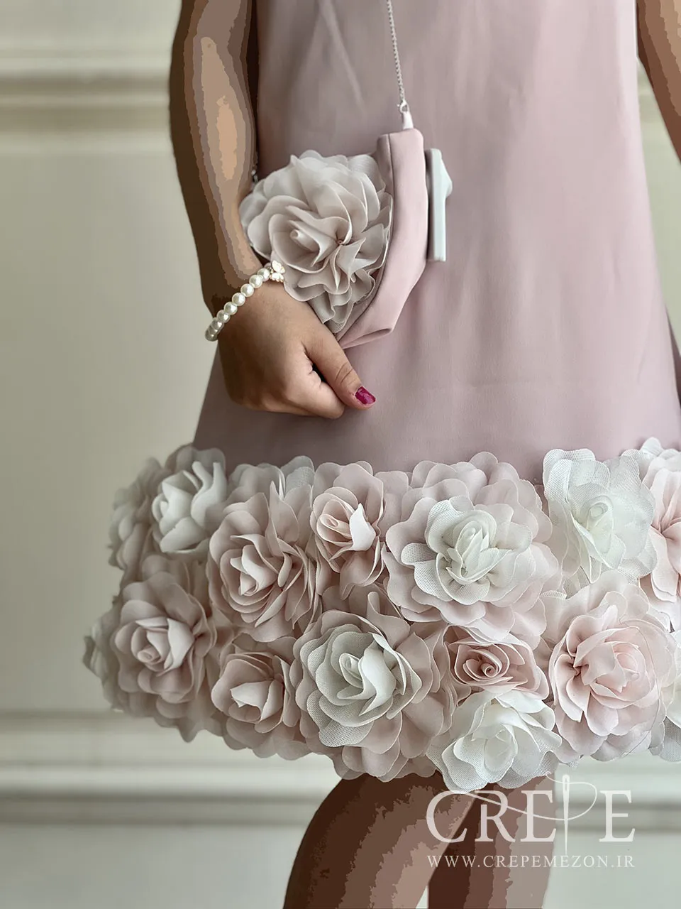 و یک کیف از جنس خود پیراهن با گلهای روی پیراهن طراحی ودوخته شده که با زنجیر نقره ای که همراه پیراهن تقدیمتون میشه وهمین گزینه هم به زیباتر شدن کار افزوده .