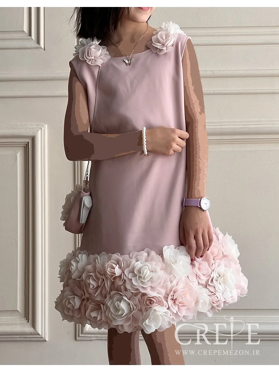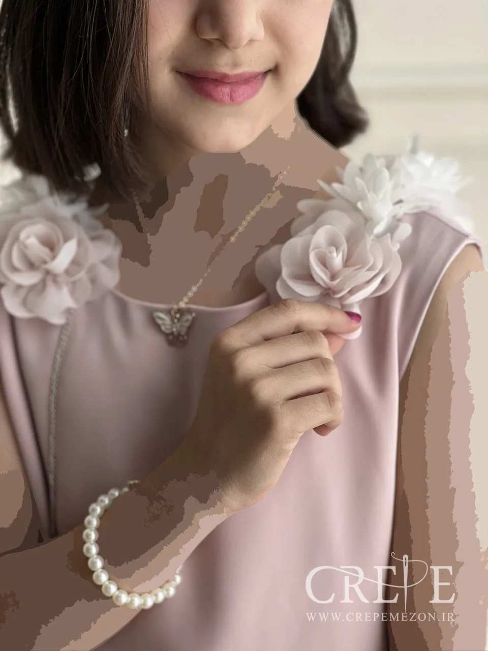 این اکسسوری ها شامل گل های درست شده از رنگ خود پیراهن در سایزهای بزرگ وکوچیک و رنگ سفید هستش که قسمت پایین دامن به صورت دو ردیف پر دوخته شده و هم قسمت سرشانه پیراهن دوخته شده