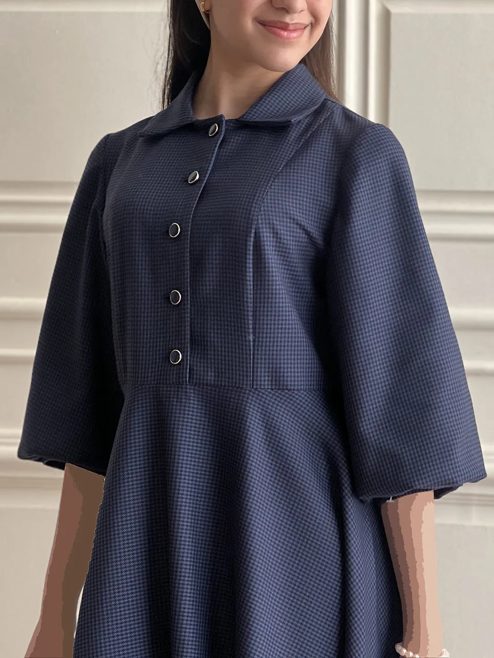 یقه پیراهن شکاری دوخته شده یک یقه ساده و زیبا و پوشیده با آستین سه ربع با مچ باریک با طرح فانوسی که در عین سادگی زیبا و شیکه ..