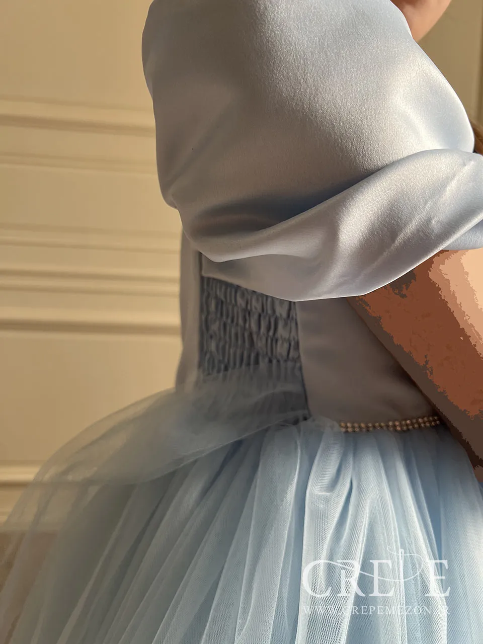 این پیراهن از بالاتنه ساتن و دامن تور طراحی ودوخته شده ، یالاتنه این پیراهن با یقه قایقی زیبا که یک حالت پاپیون بزرگ بر روی یقه دارد طراحی شده شده که