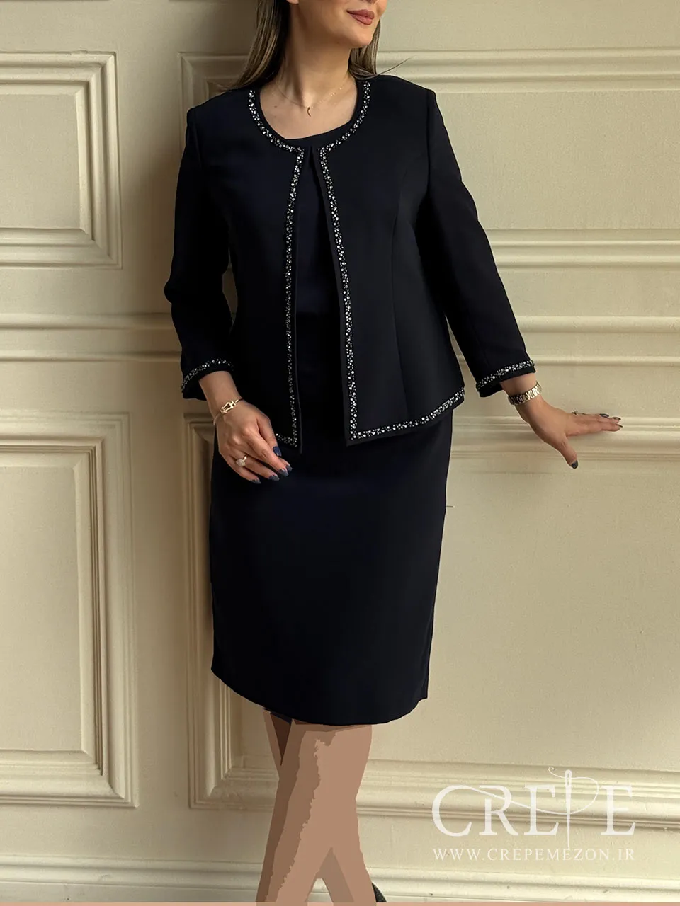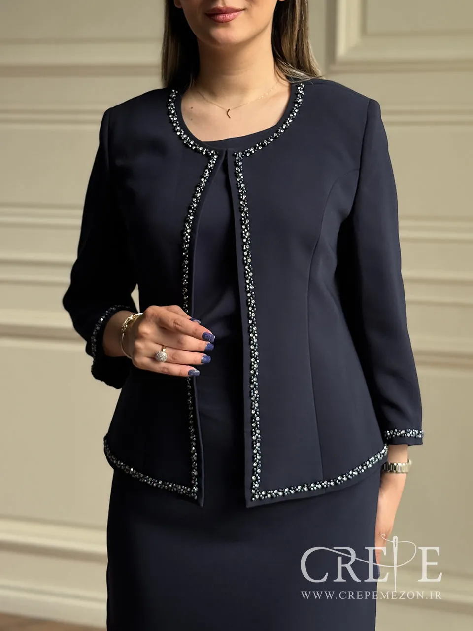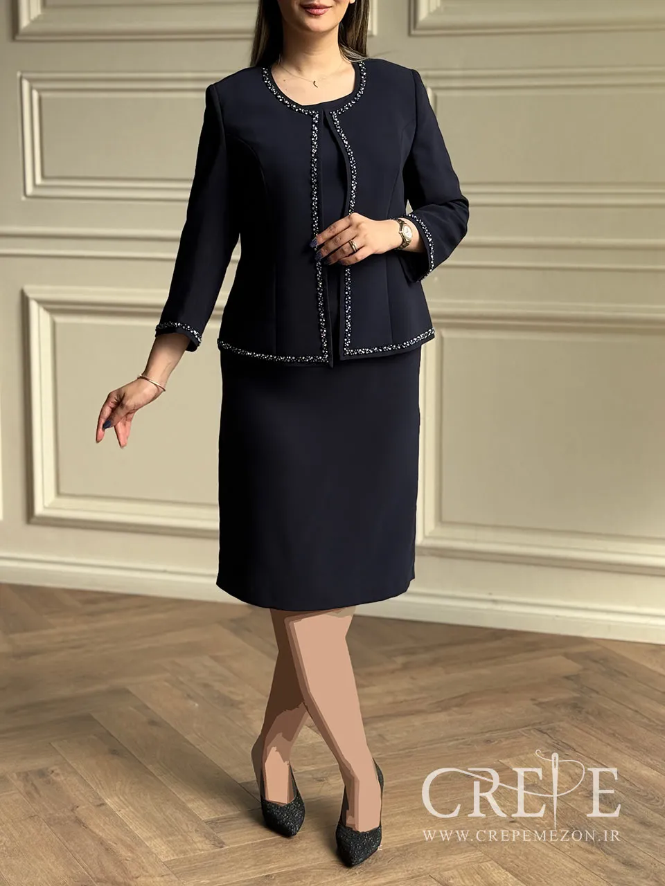 سه تیکه حاشیه سنگدوزی که شامل کت دامن تاپ می باشد یک انتخاب شیک برای مادران عزیز بوده و جلوه سکه دار و اصیلی در تن خواهد داشت. جنس کت دامن کرپ مرکوری است.