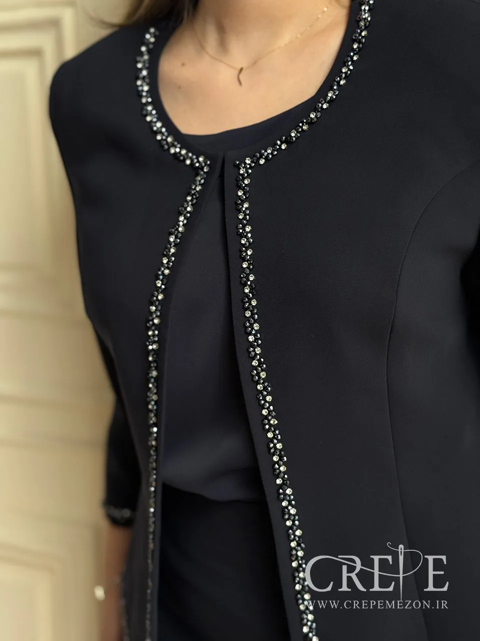سه تیکه حاشیه سنگدوزی که سامل کت دامن تاپ می باشد یک سه تیکه باشکوه و سکه دار که به محض پوشیدن نگاه تحسین آمیز اطرافیان را جذب شما کرده و ابهت استایل تان را چند برابر می کند. جنس کت و دامن کرپ مرکوری است که رنگ مشکی زاغ آن کیفیت بالای پارچه را ثابت می کند. زیبایی و برند بودن این کار حتی از تصاویر نیز پیداست. همچنین دارای تاپ خنک و سبکی از جنس کرپ حریر است که باعث می شود دیگر نگران پیدا کردن آیتم برای زیر کت نباشید و یک ظاهر کامل و پارچه داشته باشید. کت این سه تیکه حاشیه سنگدوزی با آستر رویال کاور شده است تا ایست آن بهتر و مجلسی تر شده و در دوخت دامن نیز از آستر ژرسه استفاده شده است.