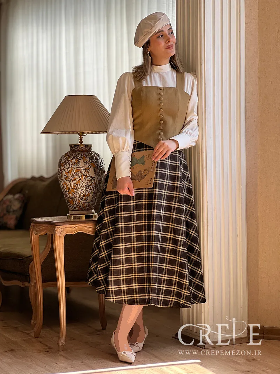 ست ژیله دامن شومیز یک ست سه تیکه پاییزه که جلیقه و دامن از جنس کشمیر و شومیز آن لینن می باشد. این سه تیکه مرغوب برای علاقمندان استایل وینتیج پیشنهاد می شود.