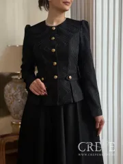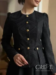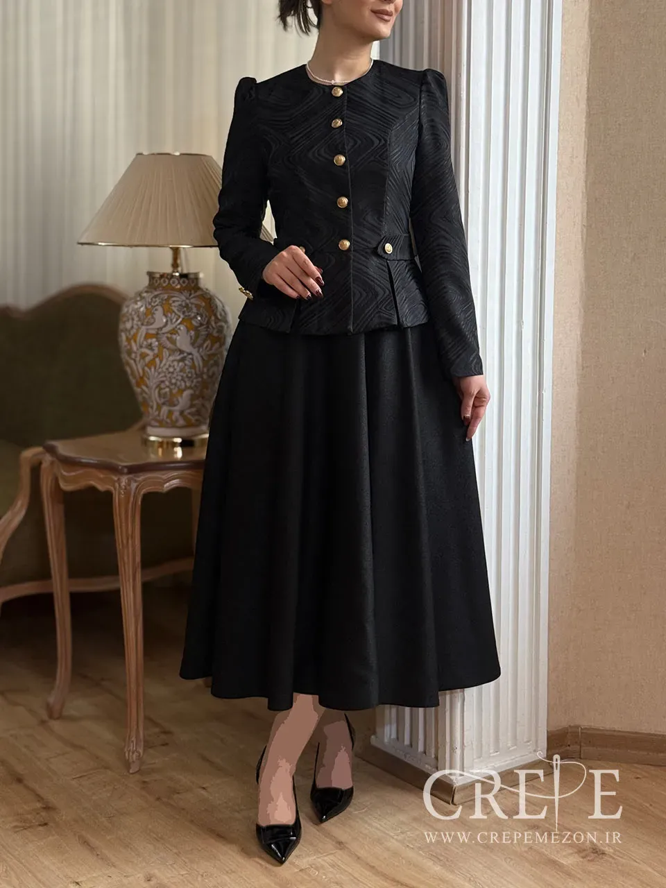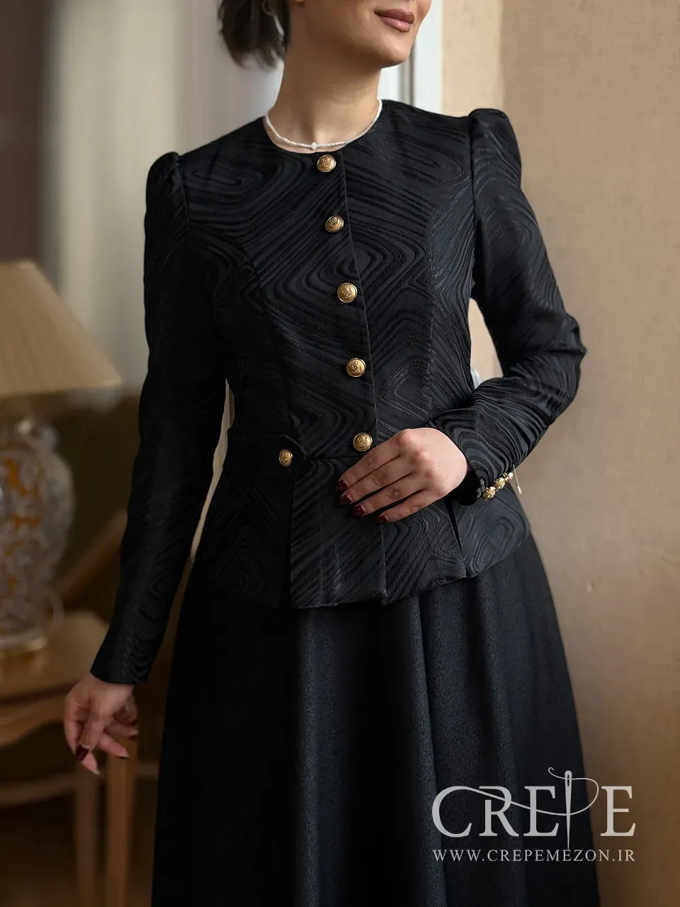 کت و سارافان موجدار یک ست مجلسی شیک و مدرن که به طور خاص برای مناسبتهای رسمی و مهمانیها طراحی شده است. این ست شامل دو قسمت اصلی یعنی کت و سارافان میباشد که هر یک از آنها ویژگیهای خاص خود را دارند. کت از پارچه ژاکارد با طرح موجدار تهیه شده است که علاوه بر زیبایی، بافت نرم و لطیفی دارد. این کت دارای آستینهای بلند است که آن را برای فصول مختلف مناسب میسازد. کت به صورت جلودکمه طراحی شده و دکمههای آن طلایی رنگ هستند که زیبایی و شیک بودن را دوچندان میکنند.