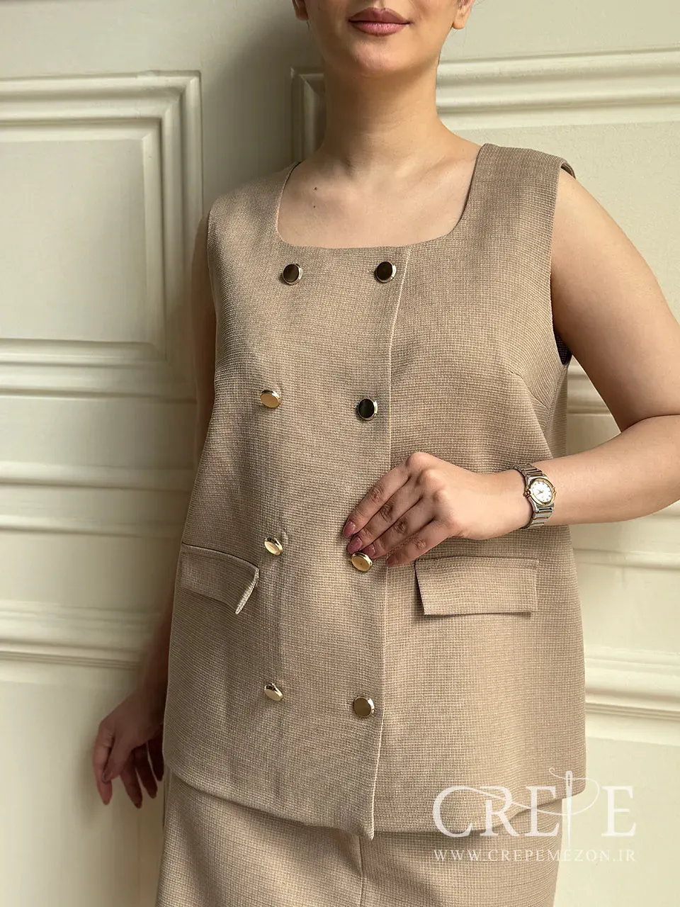 ژیله با قد 65 و یقه خشتی، بسیار شیک و خاص است. آن را بر روی یک بلوز یا پیراهن ساده و بدون طرح و با رنگ مناسب (مثلاً سفید یا کرم) بپوشید تا تمرکز بر روی جلیقه باشد.